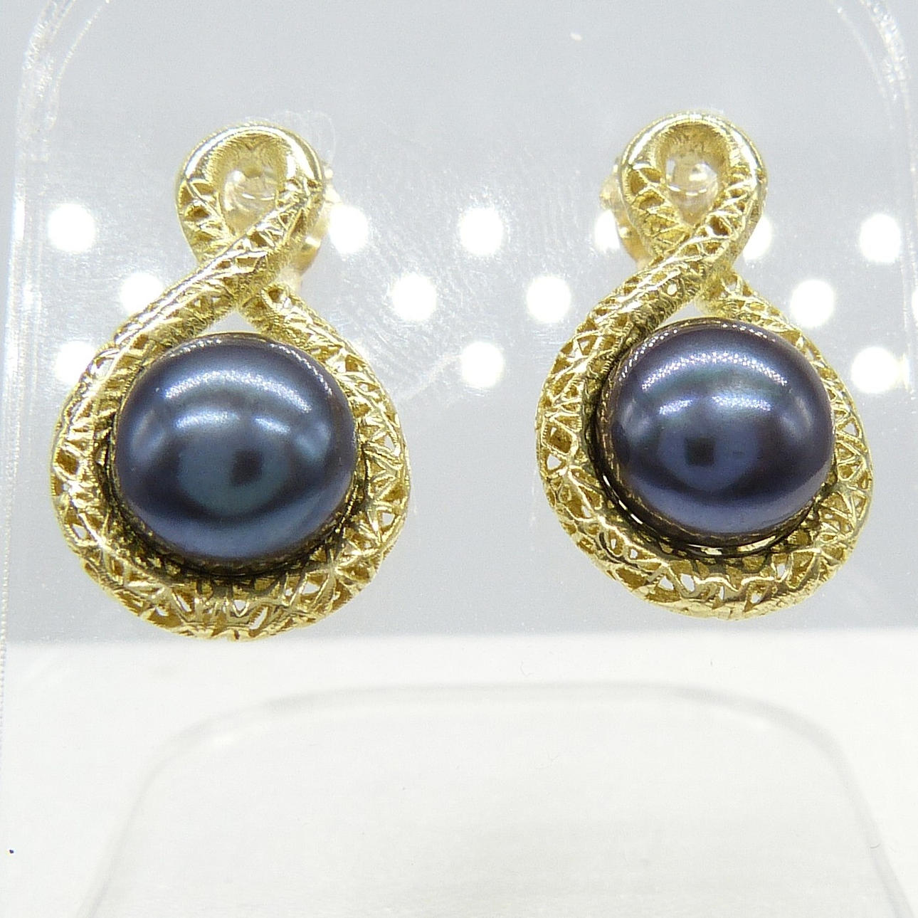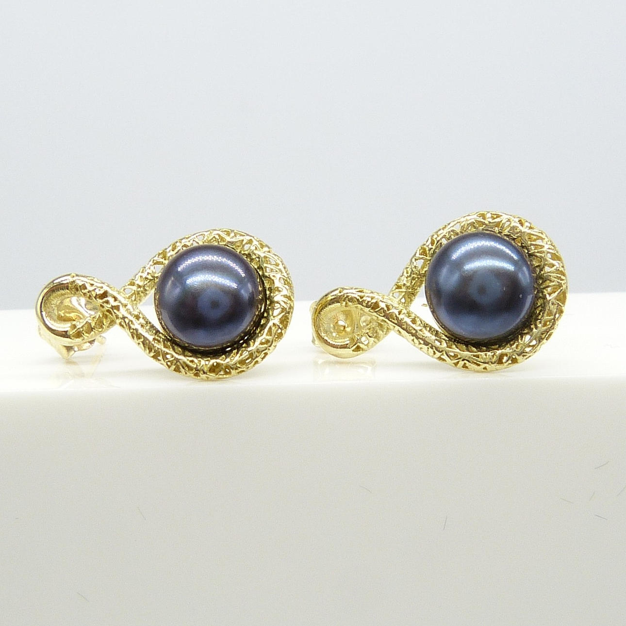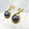 Ett par 9k gult guld ovanliga filigran mount örhängen set med runda skimrande svarta pärlor, med fjäril ryggar.