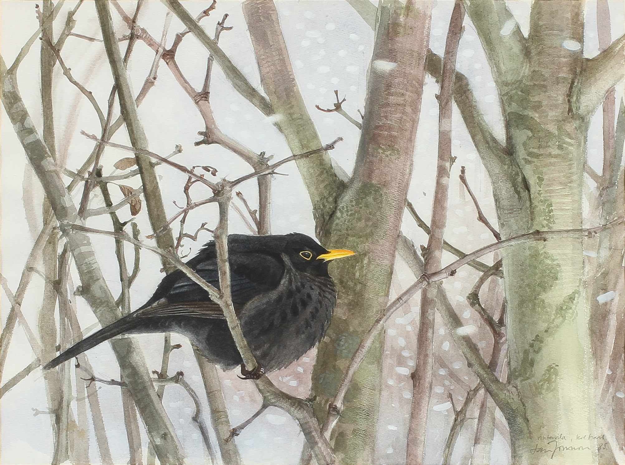 202418. LARS JONSSON. "Vintervila, koltrast", akvarell.