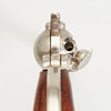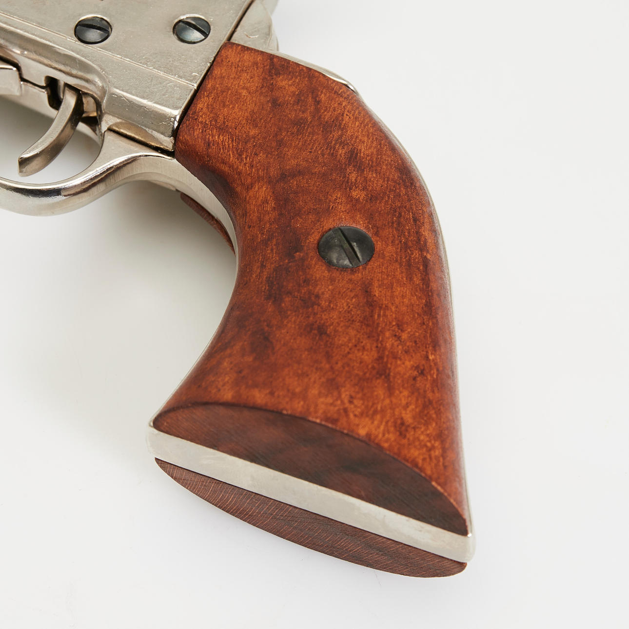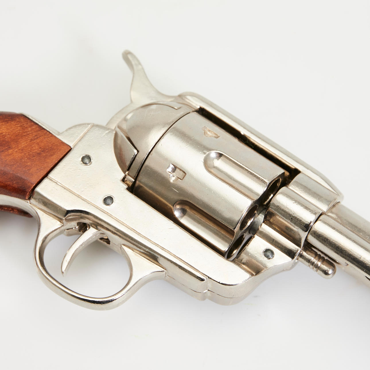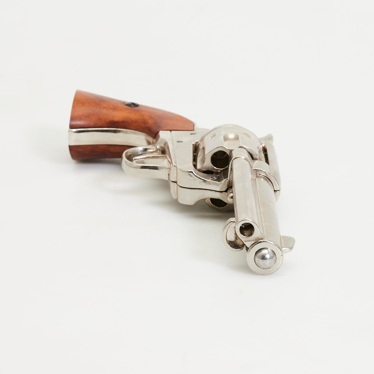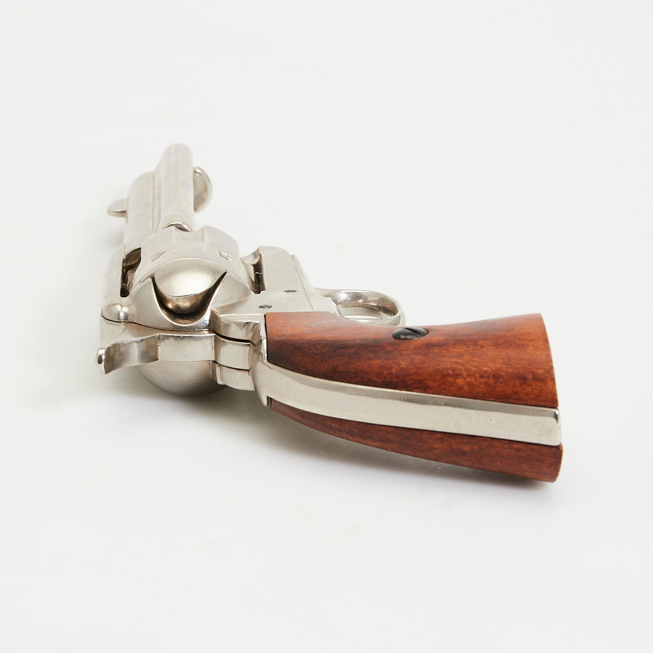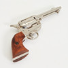 Colt revolver, kopia. Replika av en förnicklad metall Colt-revolver med en runda, slätväggig fat, sex-shot trumma, glaserade trähandtag, enkel åtgärd trigger, revolveren kan klämmas fast och slås av, kan inte skjuta, L.26cm.