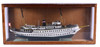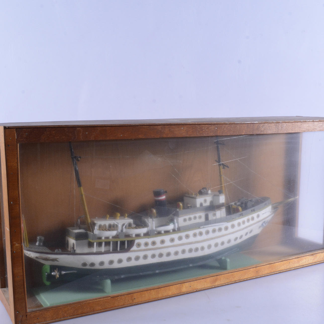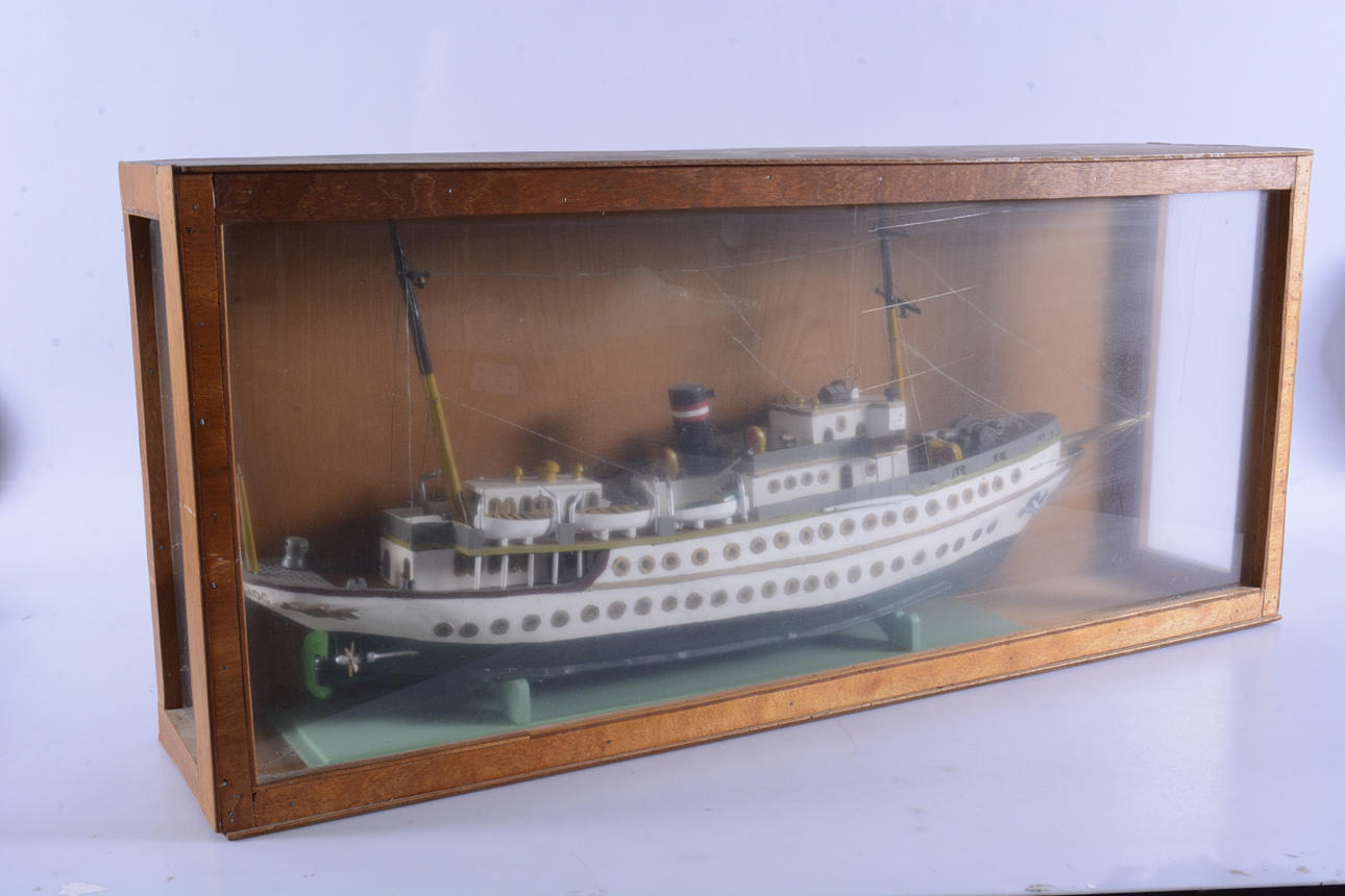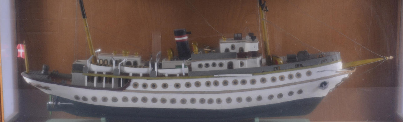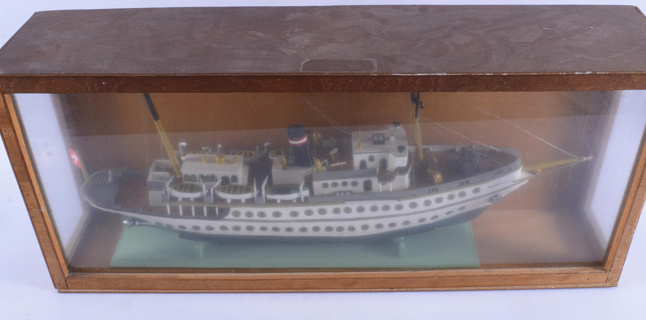 2025500. FARTYGSMODEL, bemålat trä i glasmonter, "Dannebrog".
