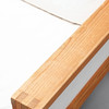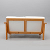 Furu. Tvåsits. Lösa stoppade dynor samt gavelsidor klädda i beigevitt bomullstyg. Längd 129, djup 76, sitthöjd 36 cm.