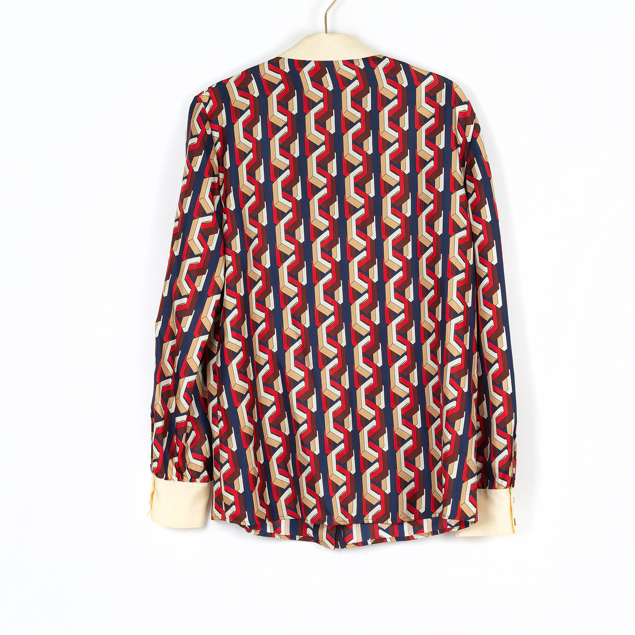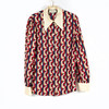 Polykromt geometriskt mönster på siden med benvit manschett och krage. Etikettmärkt GUCCI, Made in Italy. Storlek 42 enligt etikett. Ärmhåla till ärmhåla enkelt mått 48 cm. Rygglängd 68 cm.