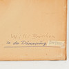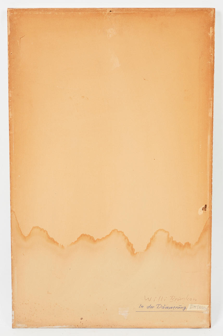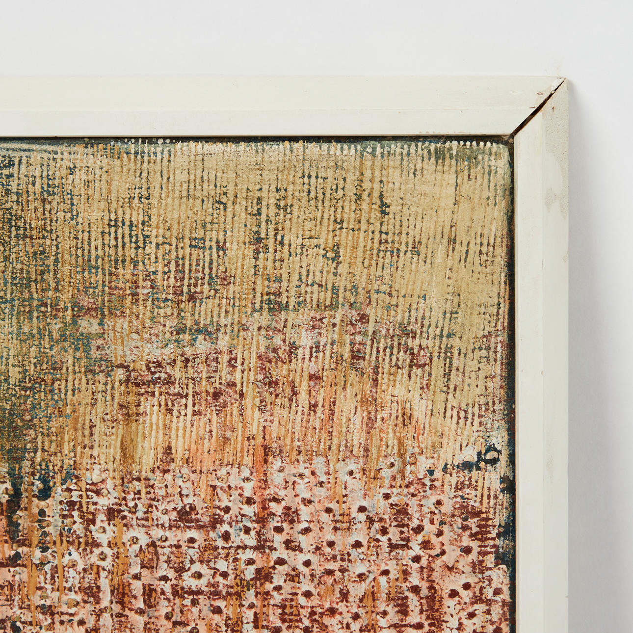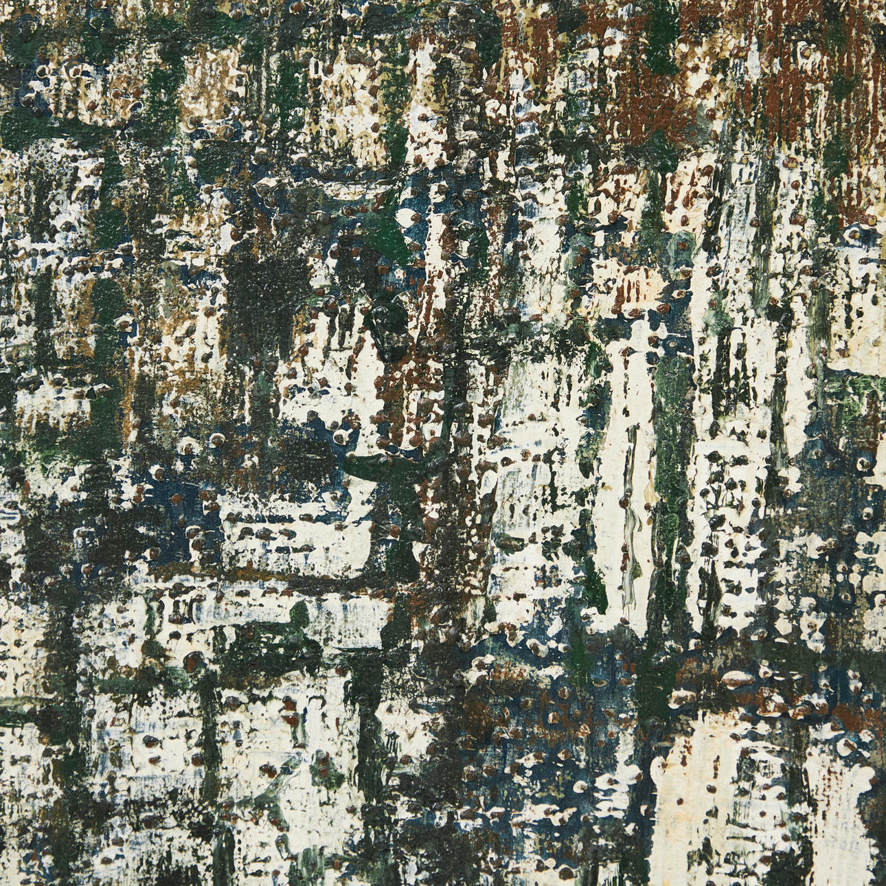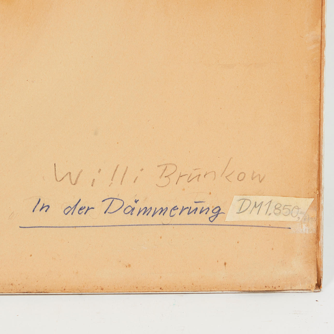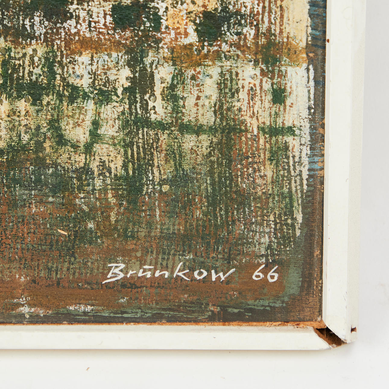 Willi Brunkow (1904-1983), målning, ”I skymningen”, blandteknik på pannå, 1966. Abstrakt komposition i grönt, vitt och brunt, signerad och daterad längst ner till höger, samt inskriven på baksidan, 90x54.5cm (93x58,5 cm).