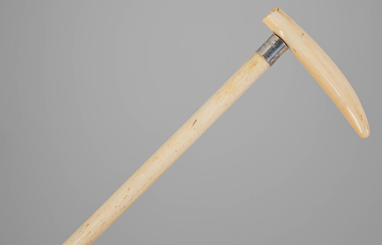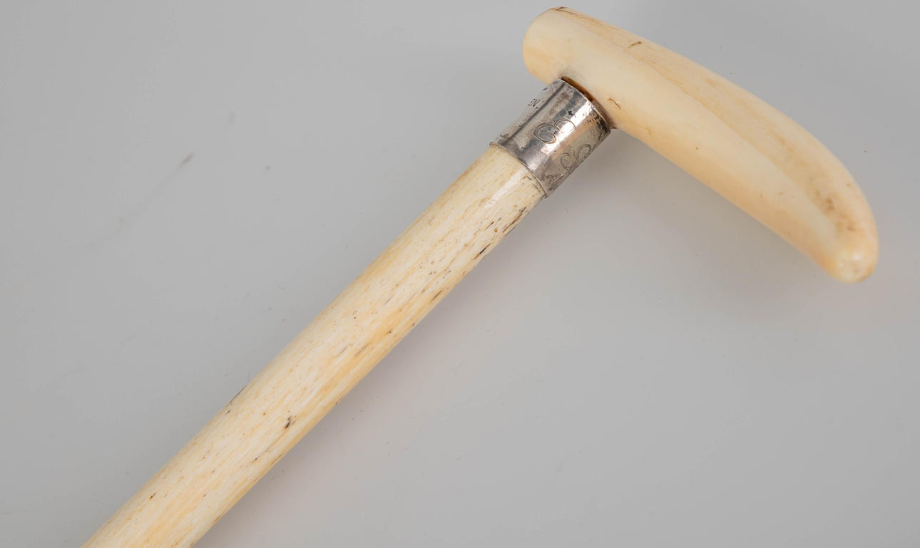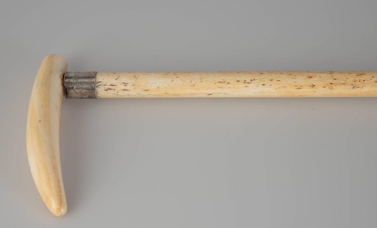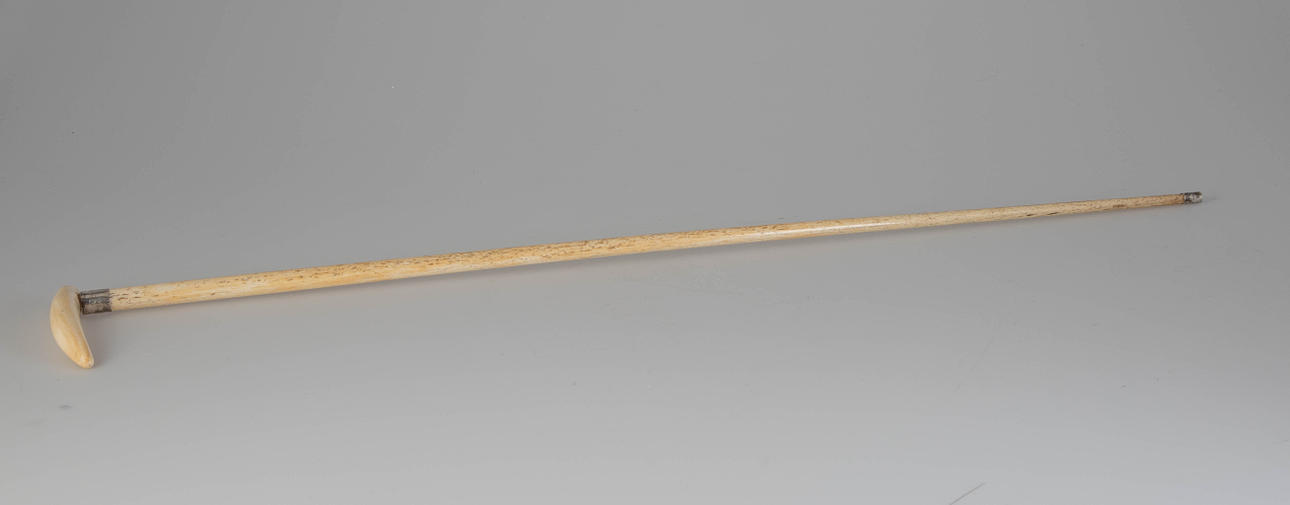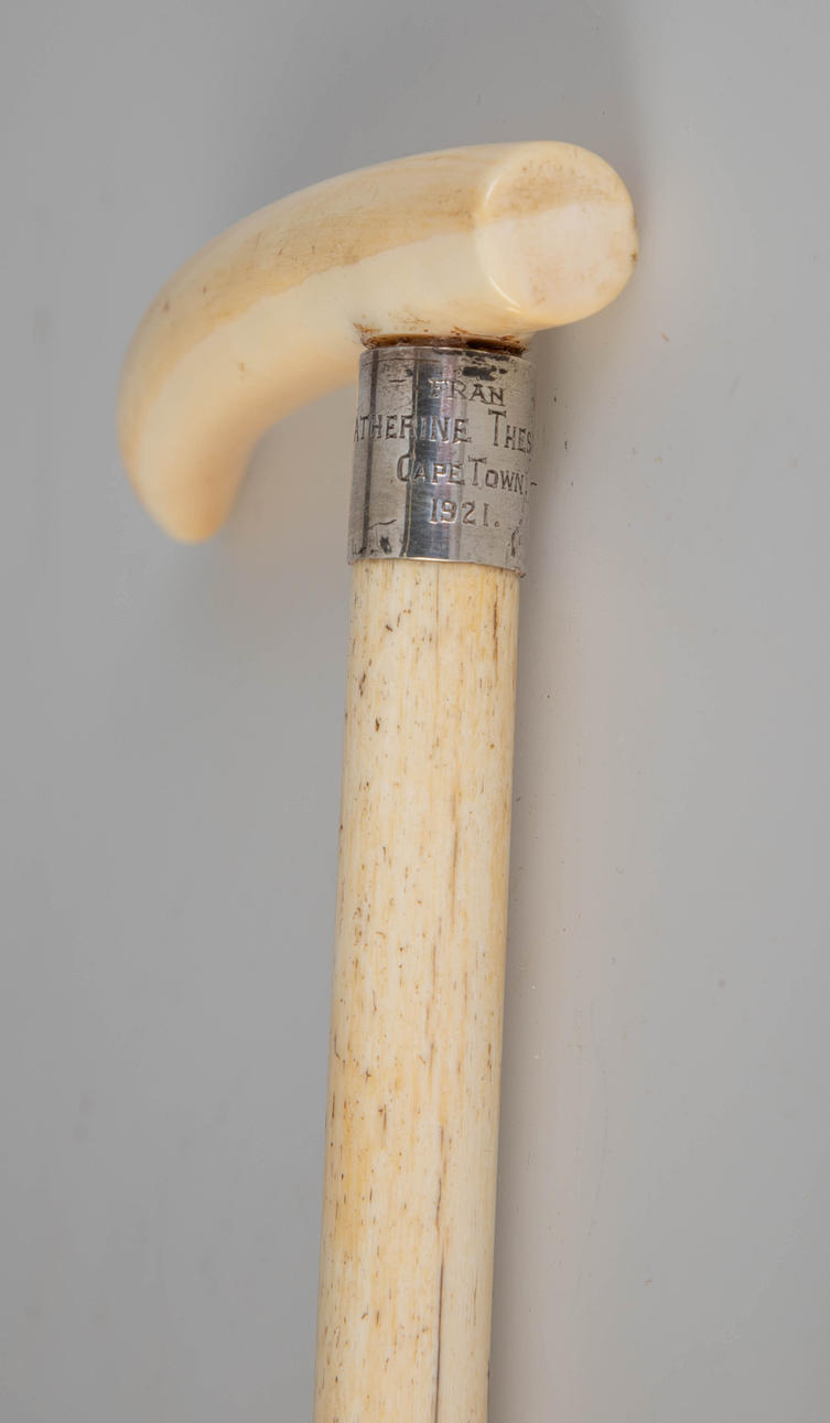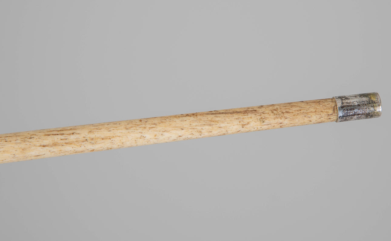 ben/silver/silverpläterad metall. Enstaka tand grepp. Avsmalnande skaft Silverring med ägargravyr ”Fram-Katherine Thesen-Cape Town-1921", monogram ”E S” på baksidan. LxD: 84,5 x 11,5 cm.