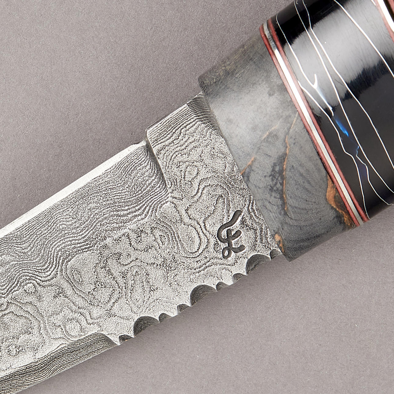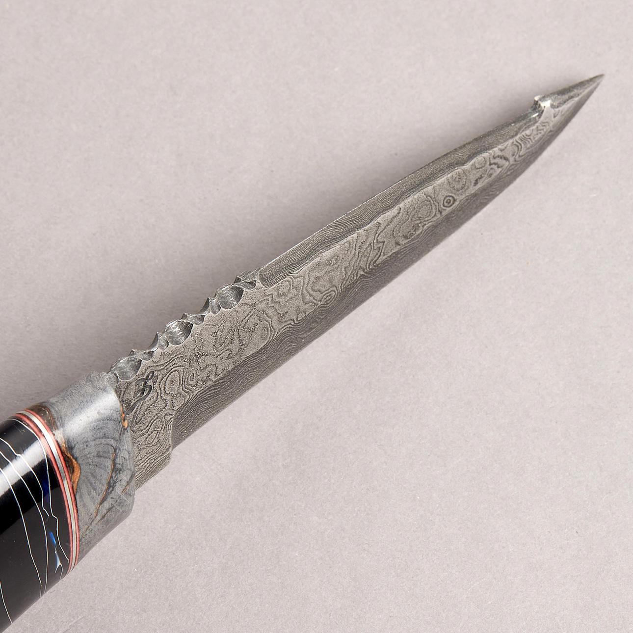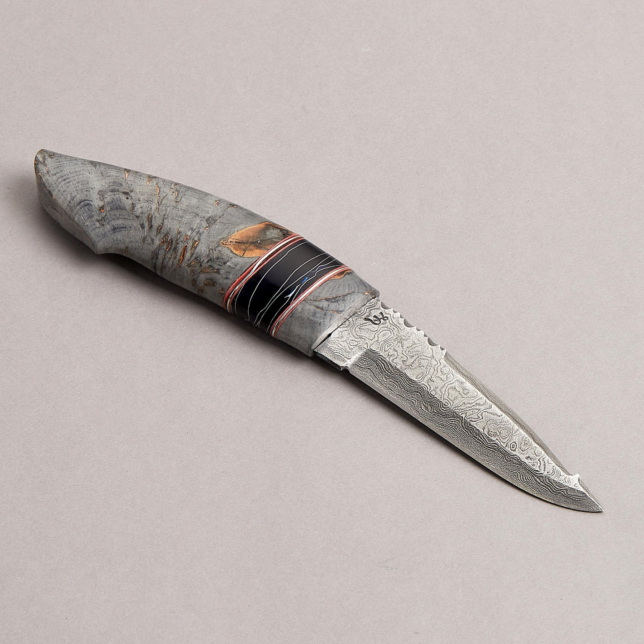 Skaft i grå amerikansk rot, svart mittdel med dekor i silvertråd, bladet otydligt märkt CL?, balja signerad TO, längd 22cm