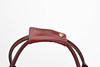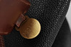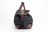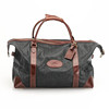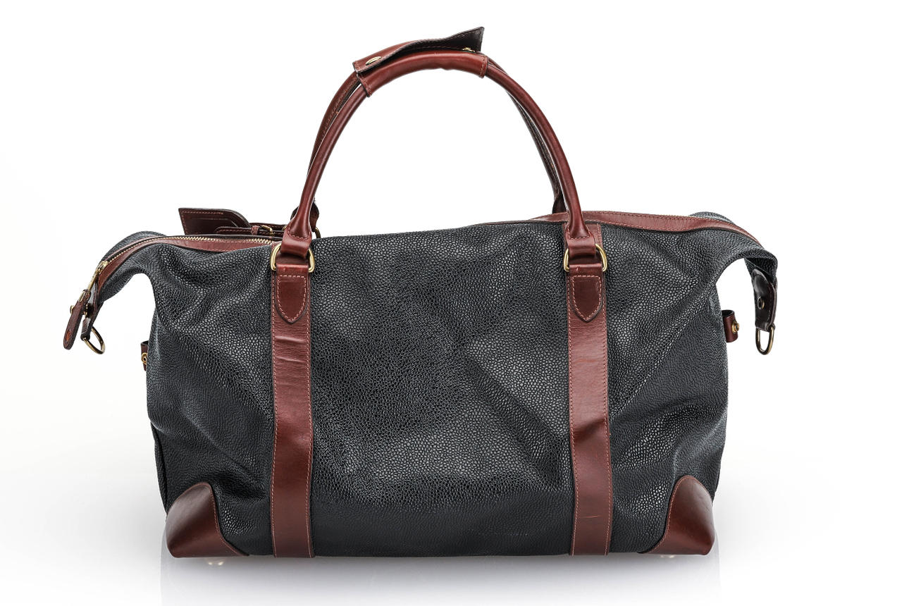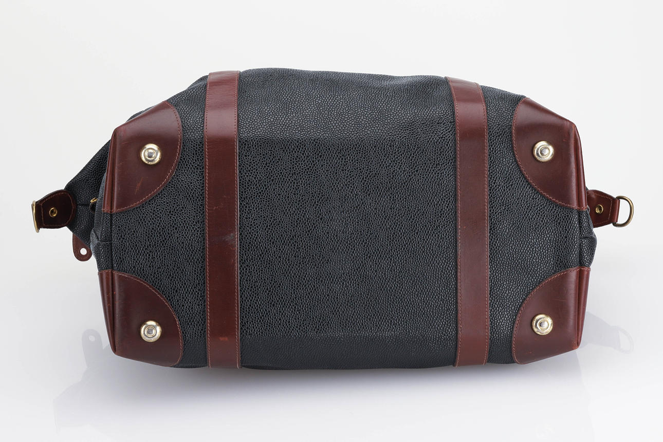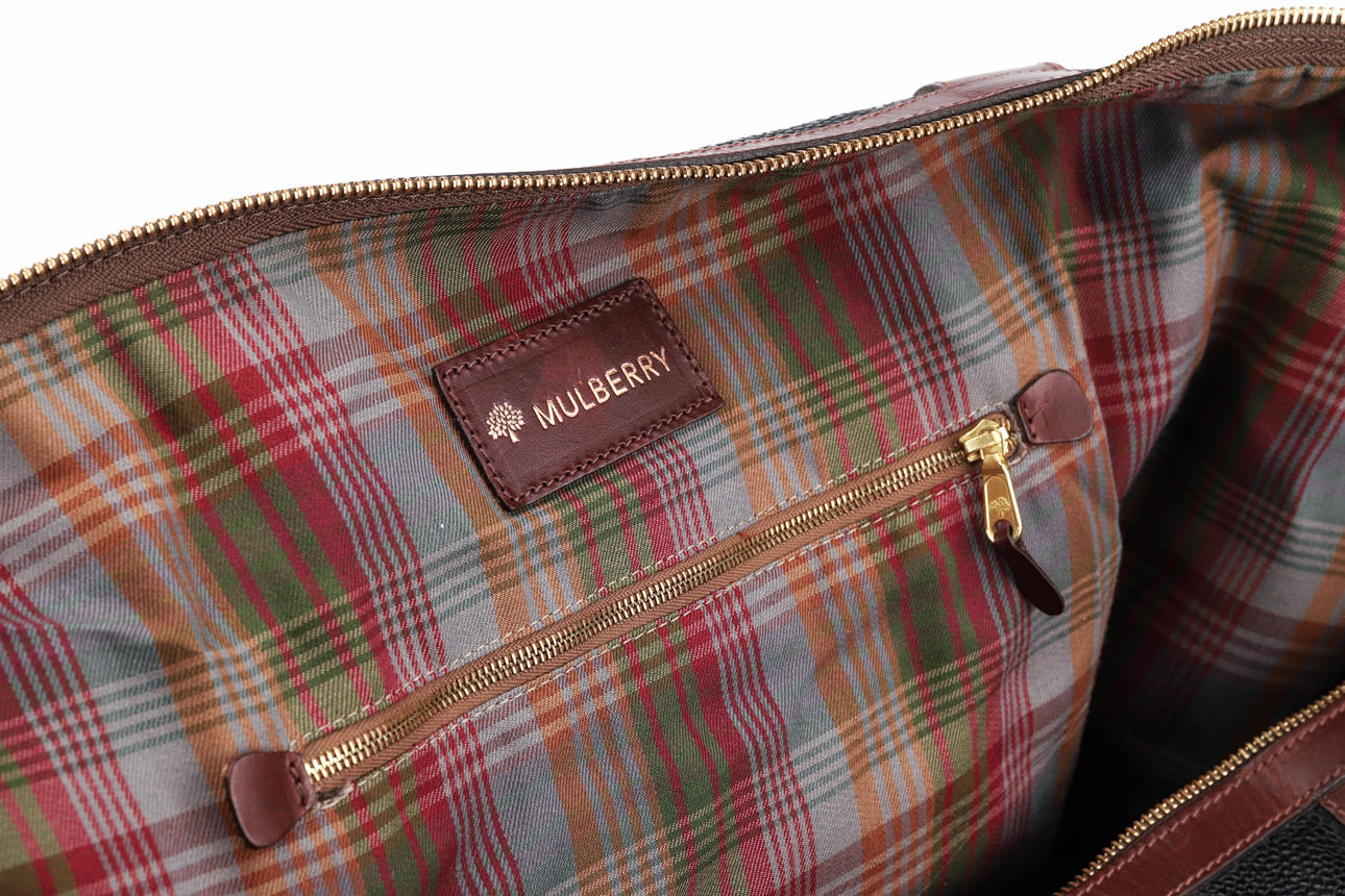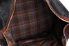 Fodrad med rutigt tyg, invändig fick med dragkedja, adresshållare, detaljer i brunt skinn och gulmetall. Längd 43 cm, bredd 21 cm, höjd ca 32 cm.