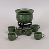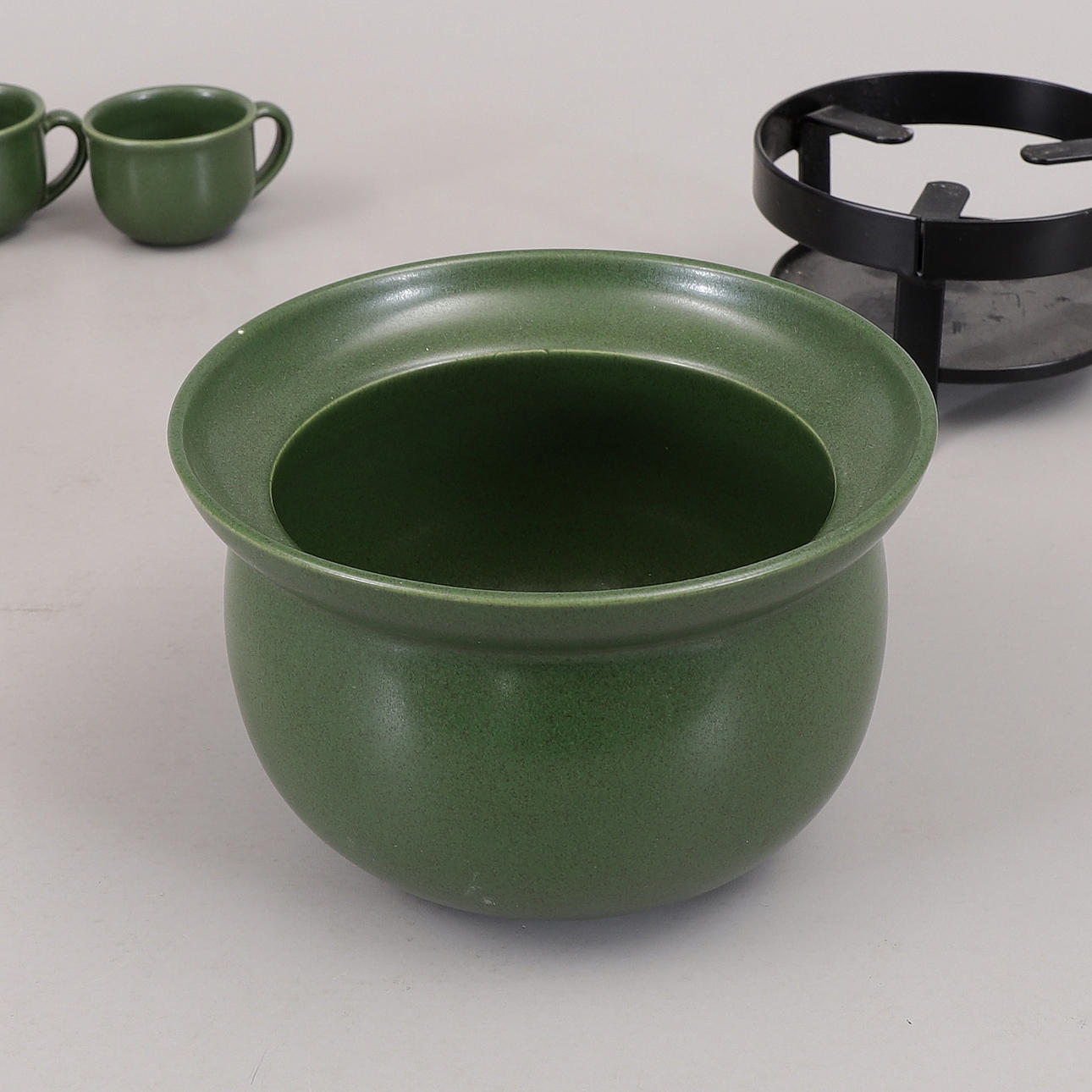 Skål, höjd 12 cm. 6 muggar, 5 cm. Värmeställ, höjd 8 cm.