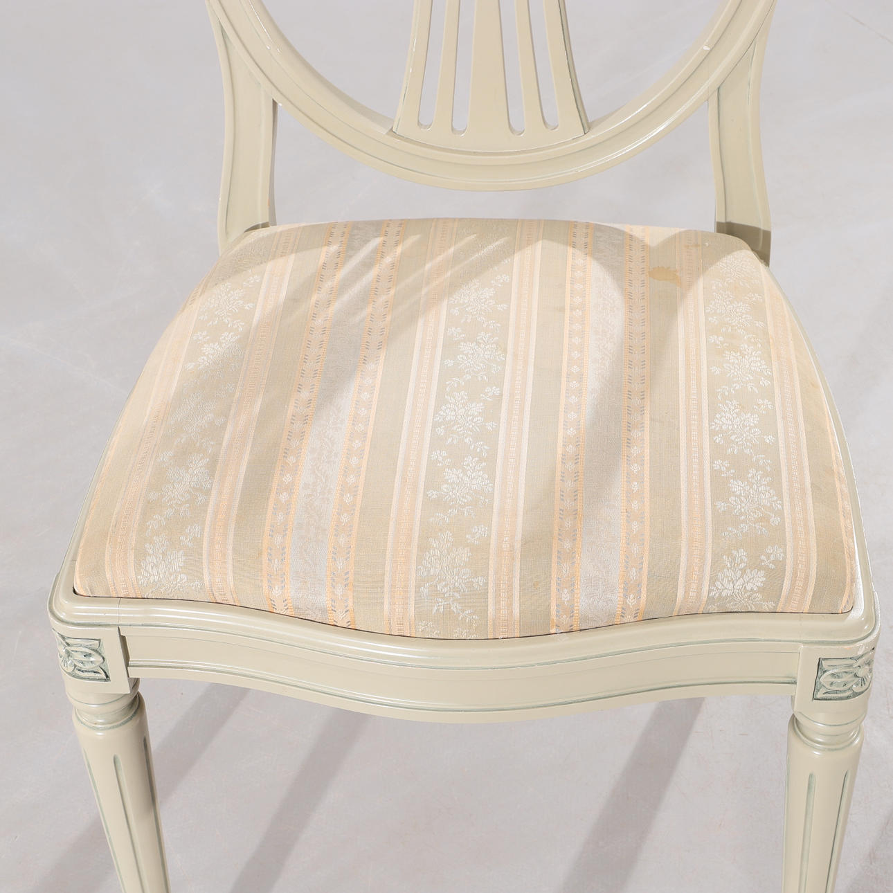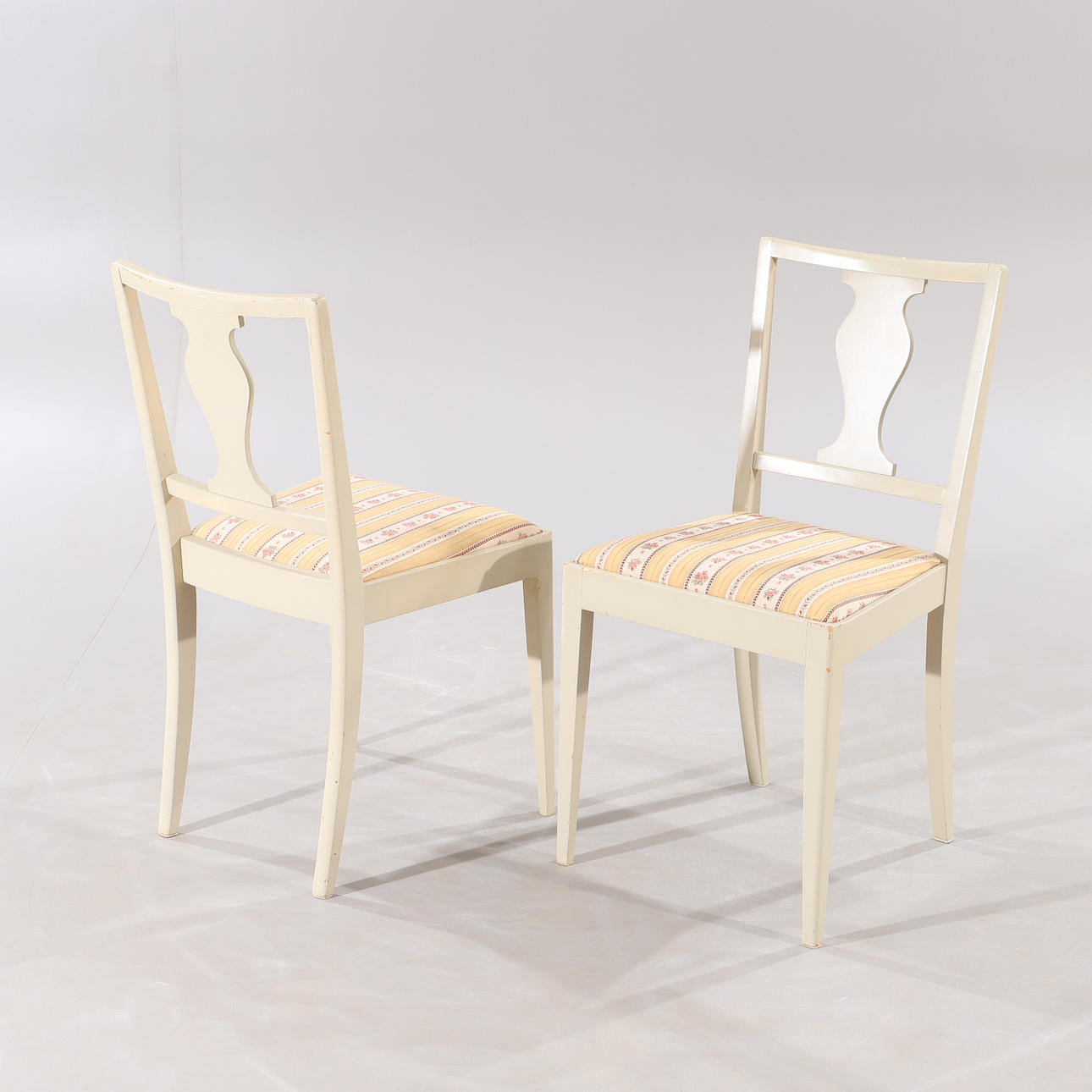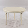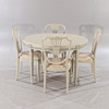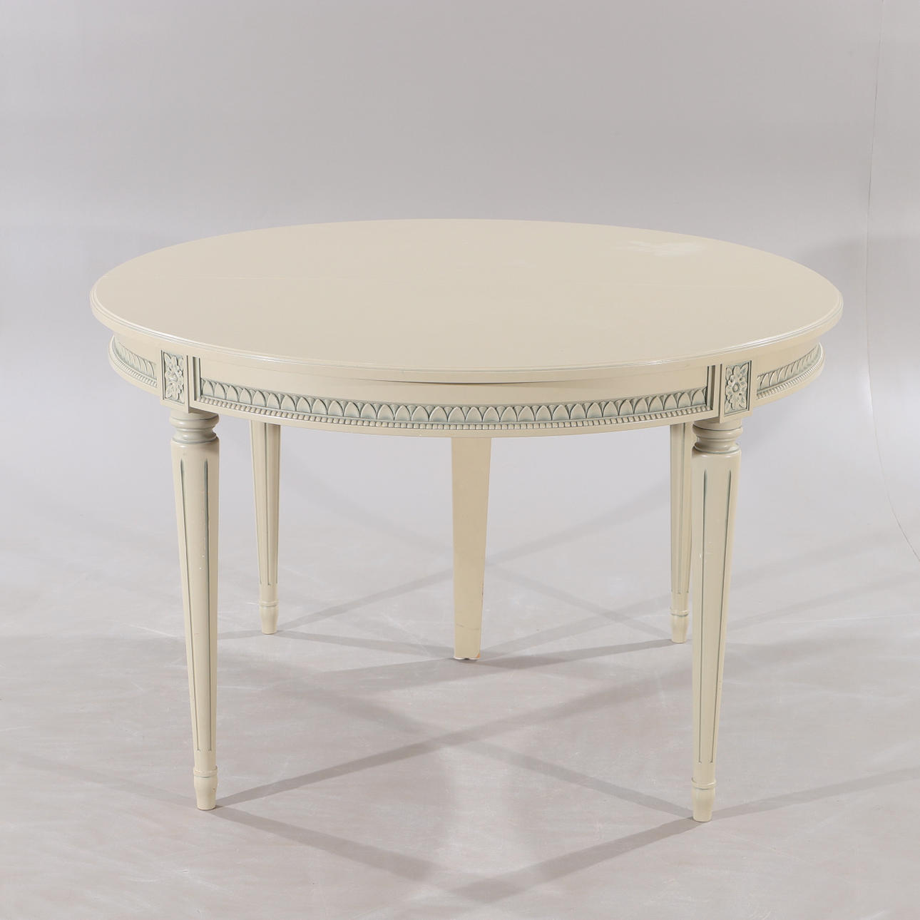 Bord, 4 stolar samt 3+1 iläggsskivor och 4 skydd. 2 extrastolar medföljer. Bordets diameter 114, höjd 72 samt skivornas bredd 55 cm.