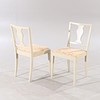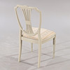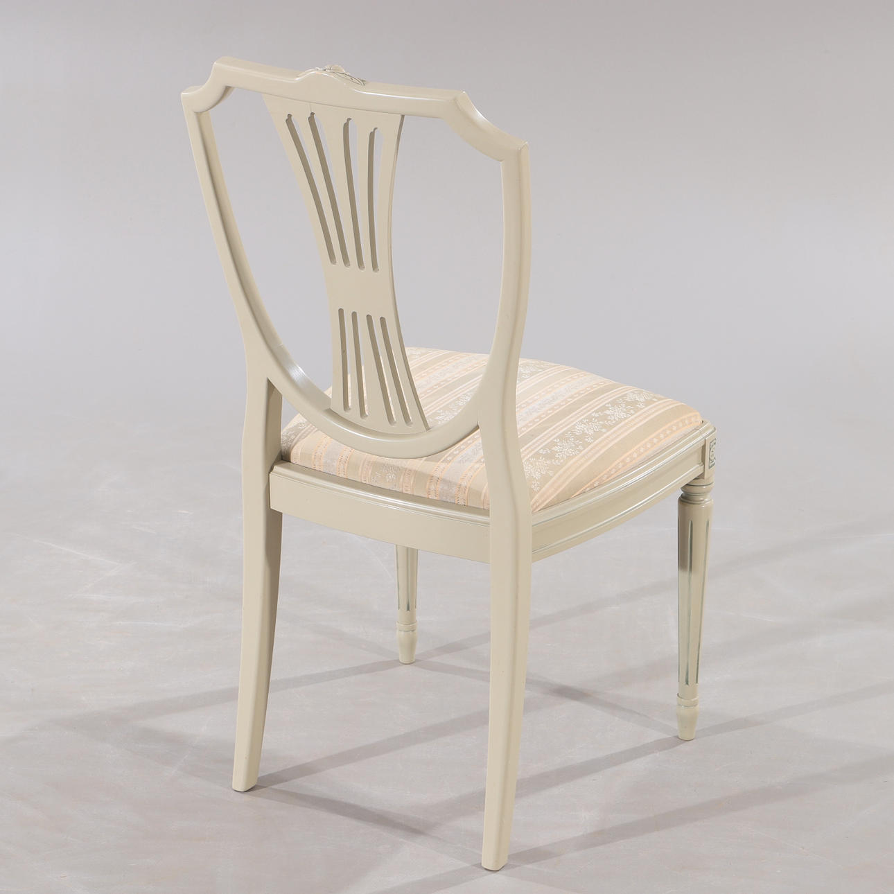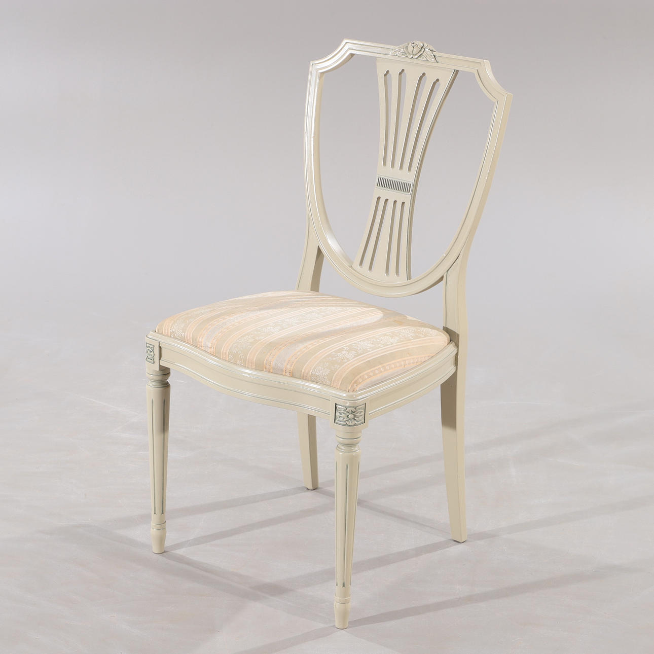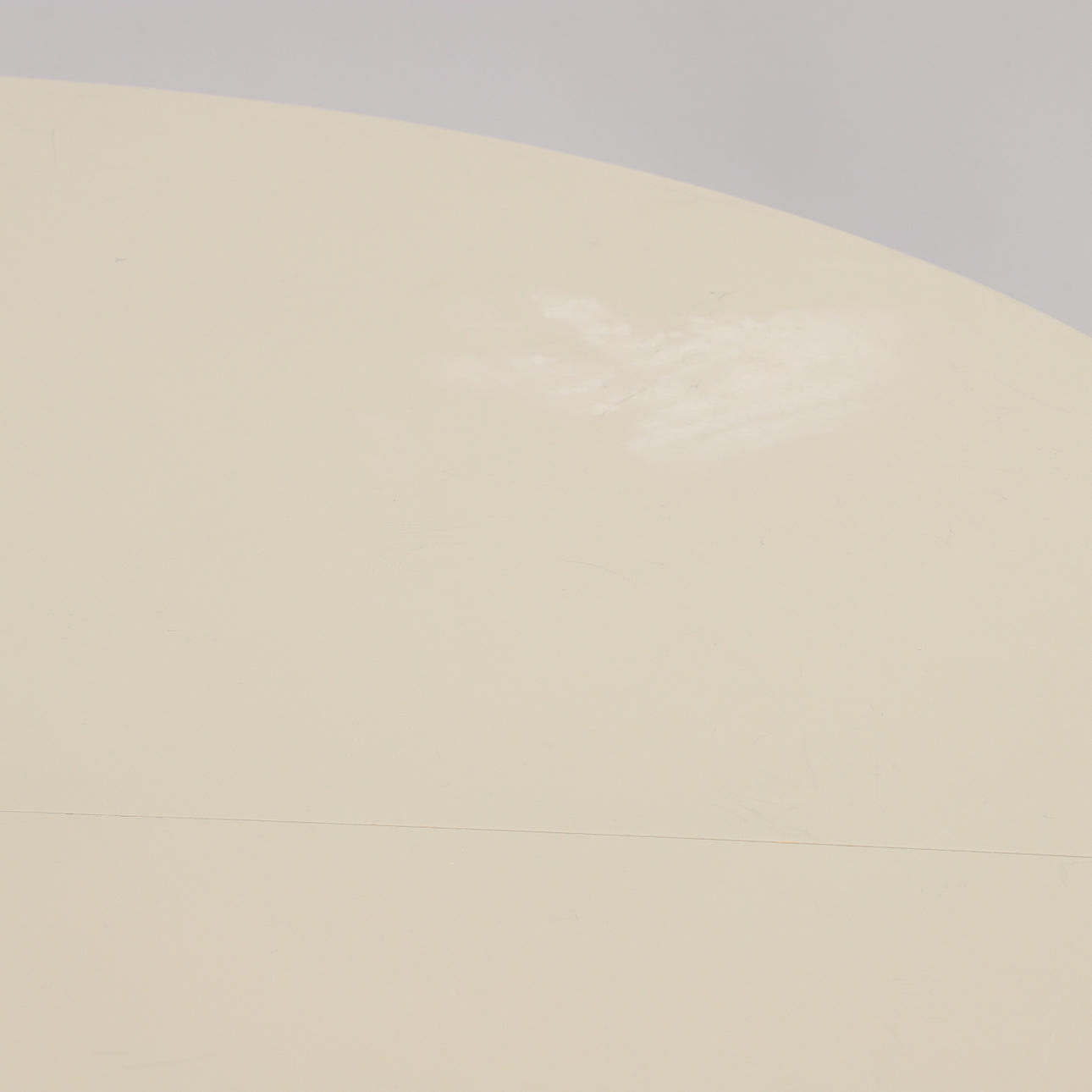 Bord, 4 stolar samt 3+1 iläggsskivor och 4 skydd. 2 extrastolar medföljer. Bordets diameter 114, höjd 72 samt skivornas bredd 55 cm.
