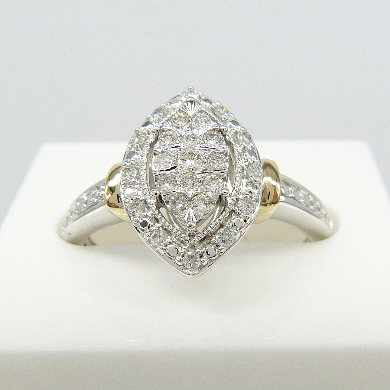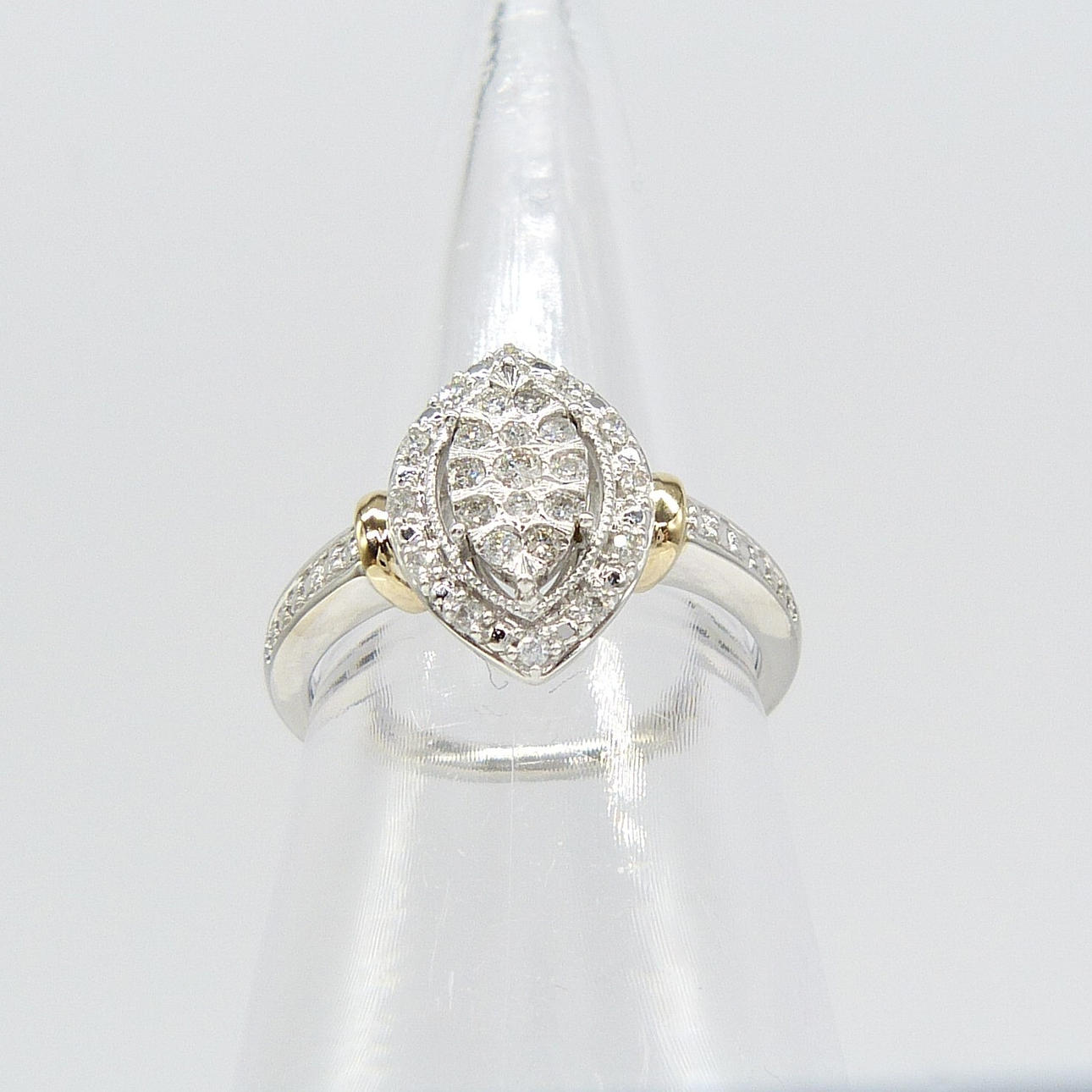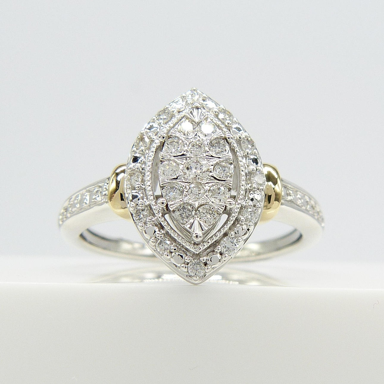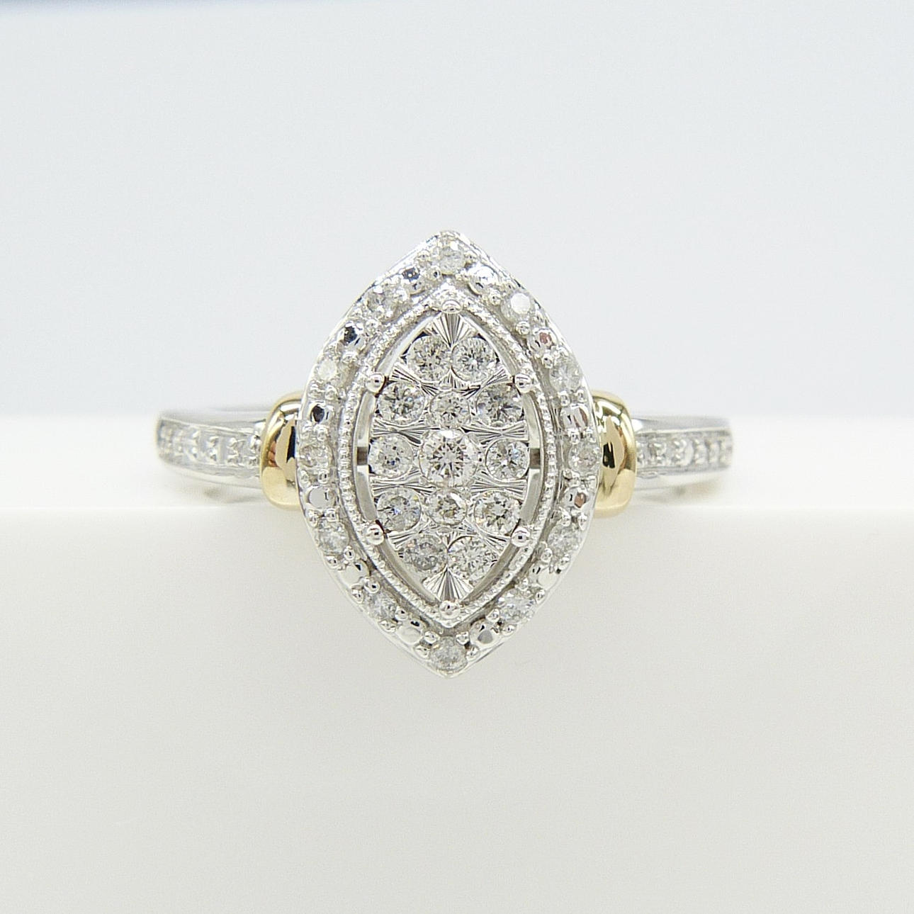 En 9k vitt och gult guld navett/marquise formade kluster ring set med 0.20 karat runda briljantslipade diamanter.