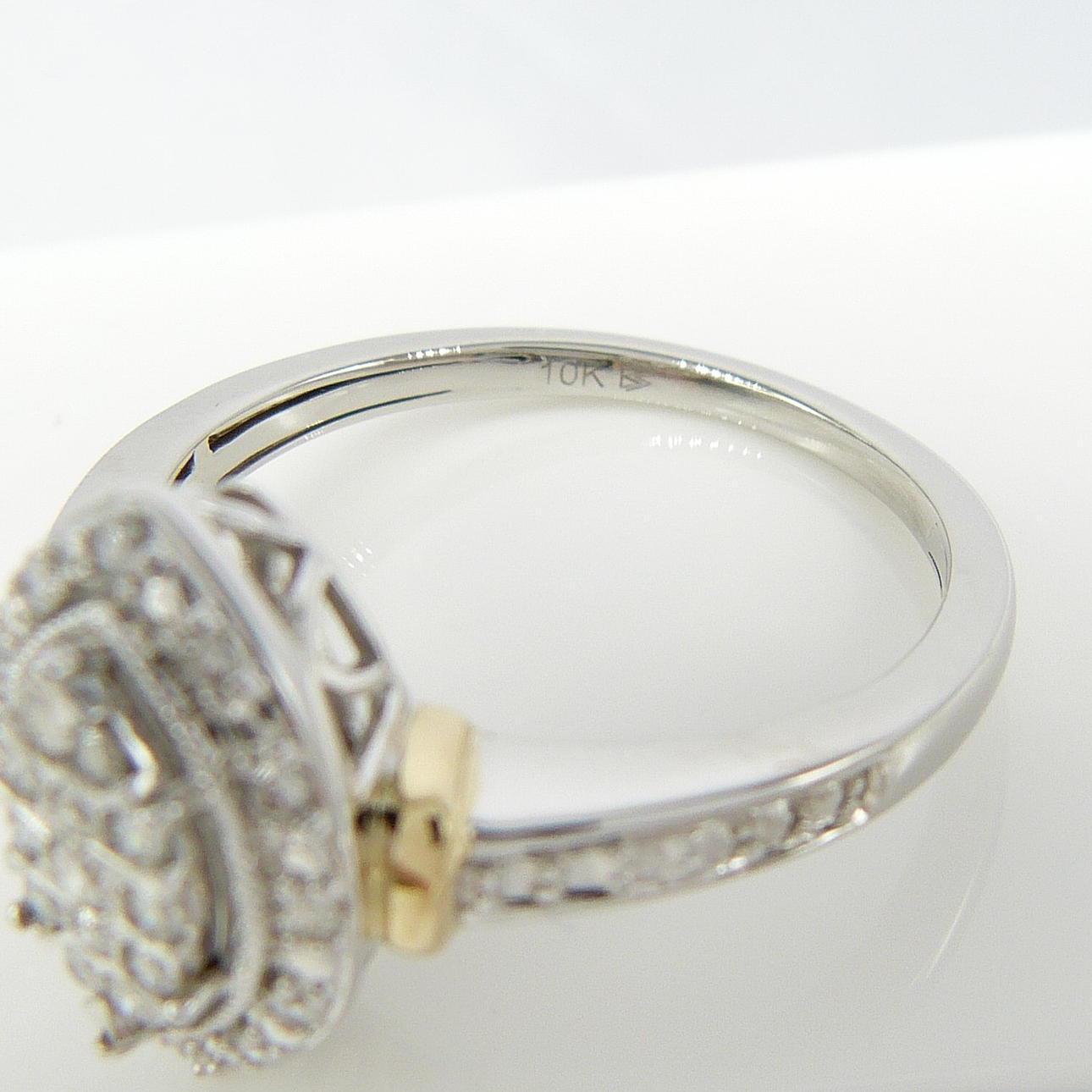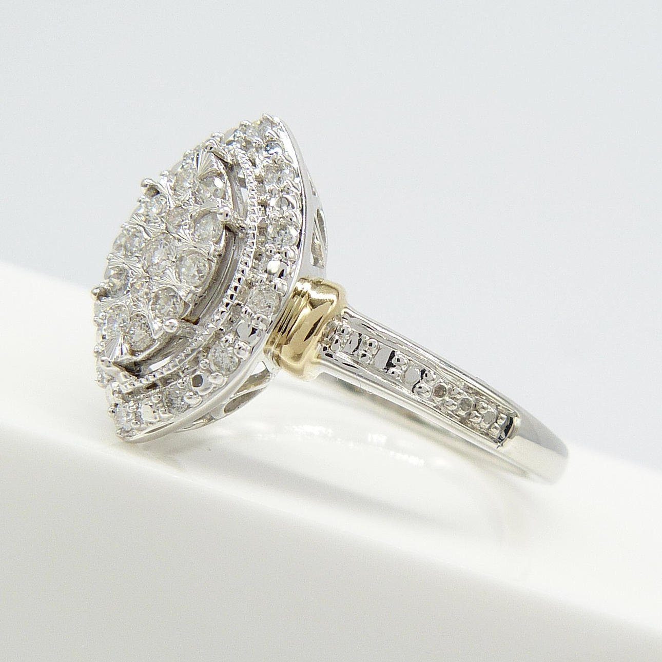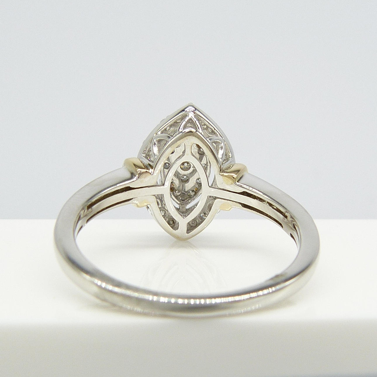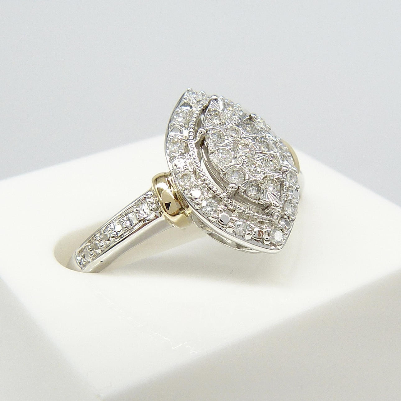 En 9k vitt och gult guld navett/marquise formade kluster ring set med 0.20 karat runda briljantslipade diamanter.
