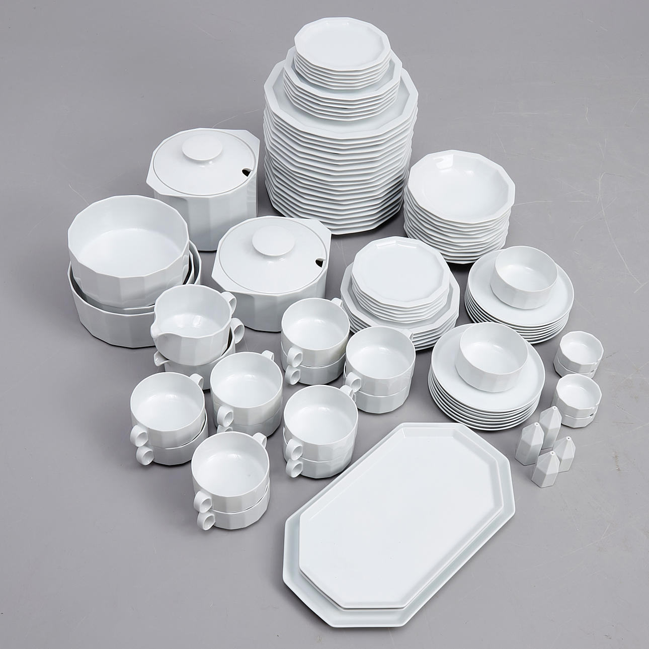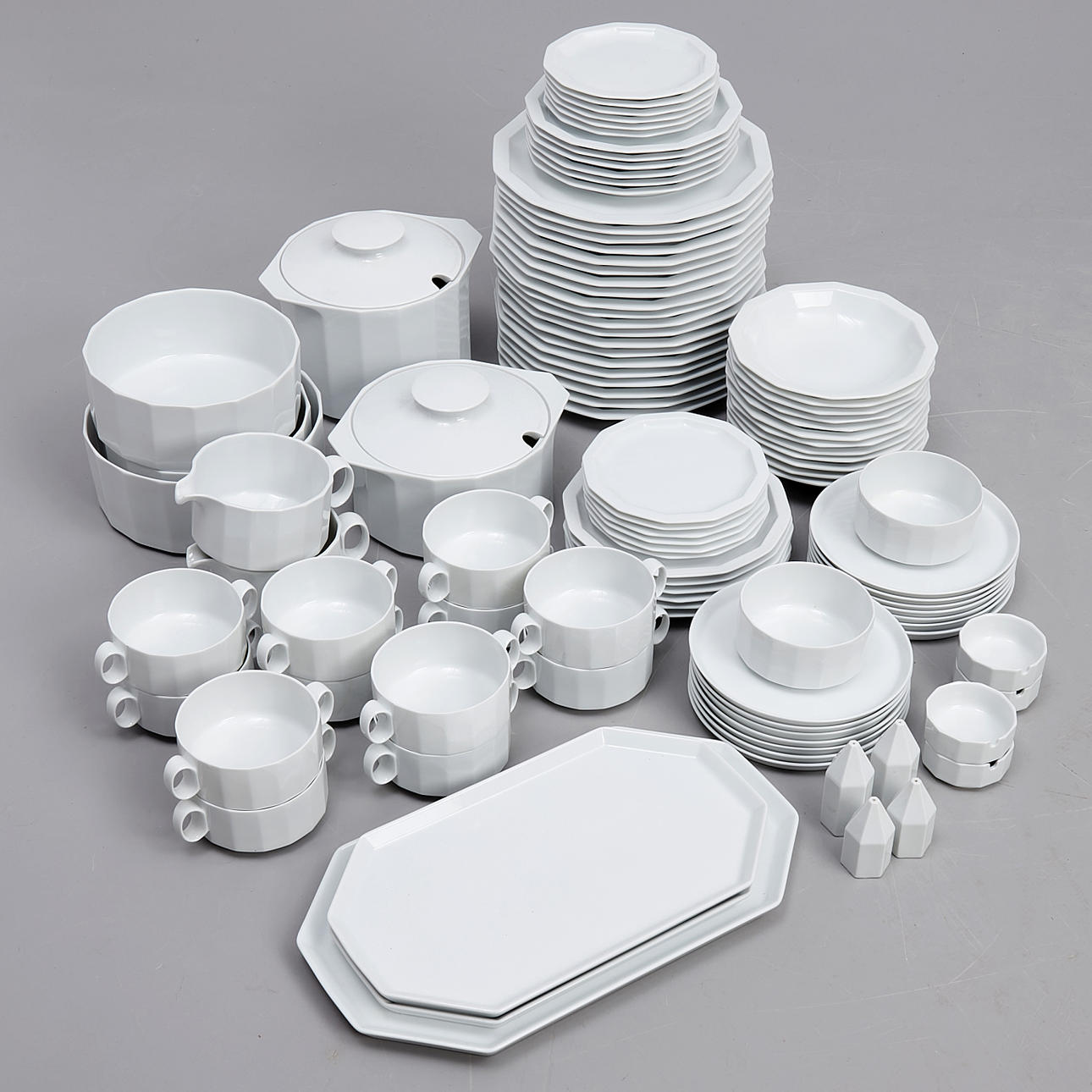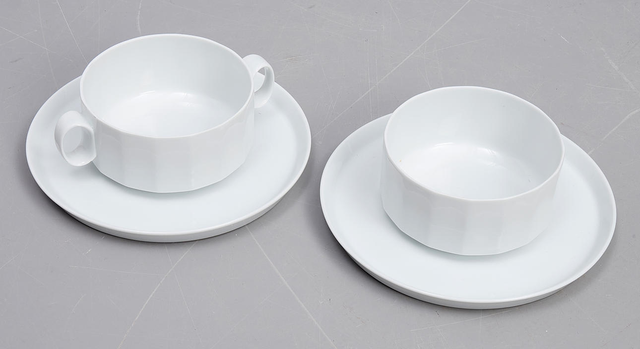 Bestående av; mattallrikar 20, djupa tallrikar 12, assietter 12, assietter (mindre) 12, skålar 5, askfat 4, peppar & saltkar 4, karotter med lock 2, buljongkoppar med fat 14, såsnipor 2.