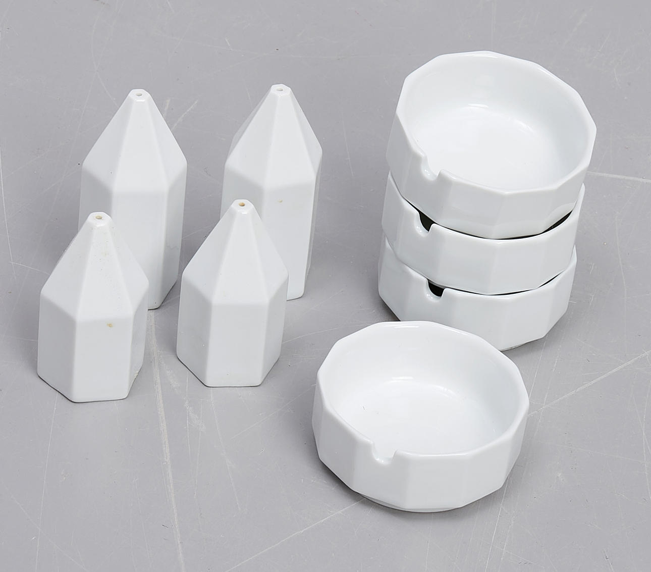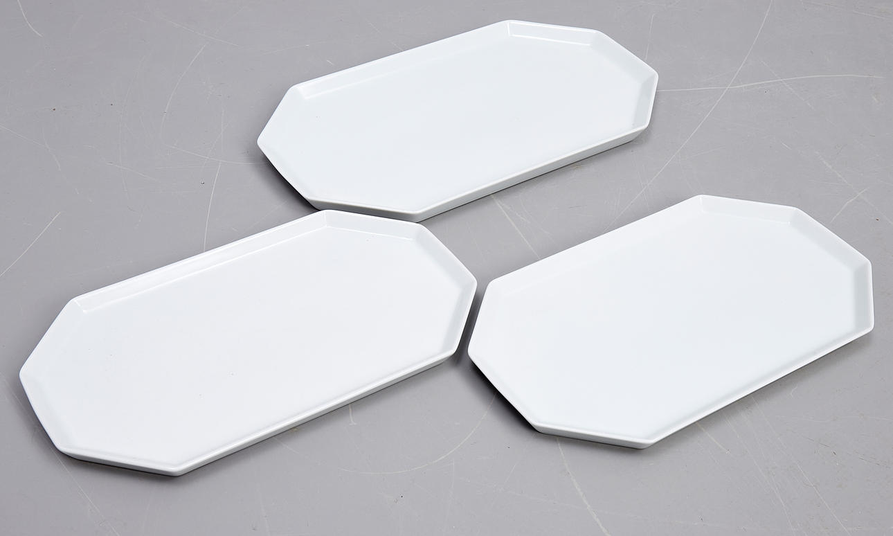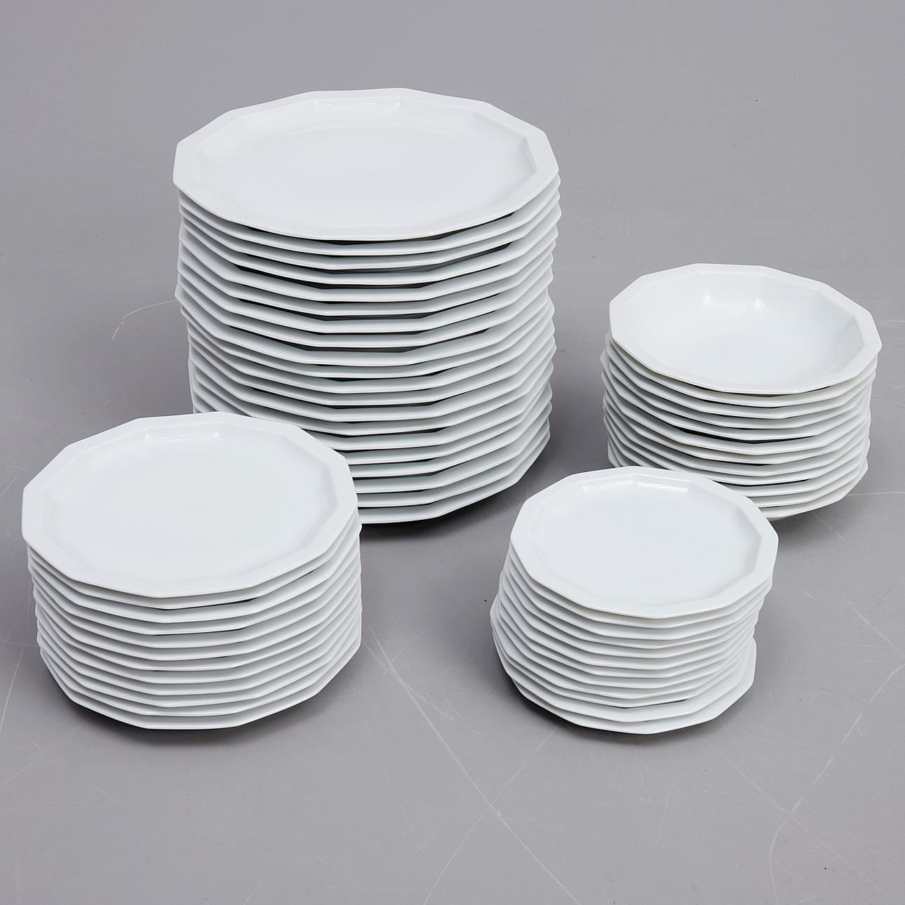 Bestående av; mattallrikar 20, djupa tallrikar 12, assietter 12, assietter (mindre) 12, skålar 5, askfat 4, peppar & saltkar 4, karotter med lock 2, buljongkoppar med fat 14, såsnipor 2.