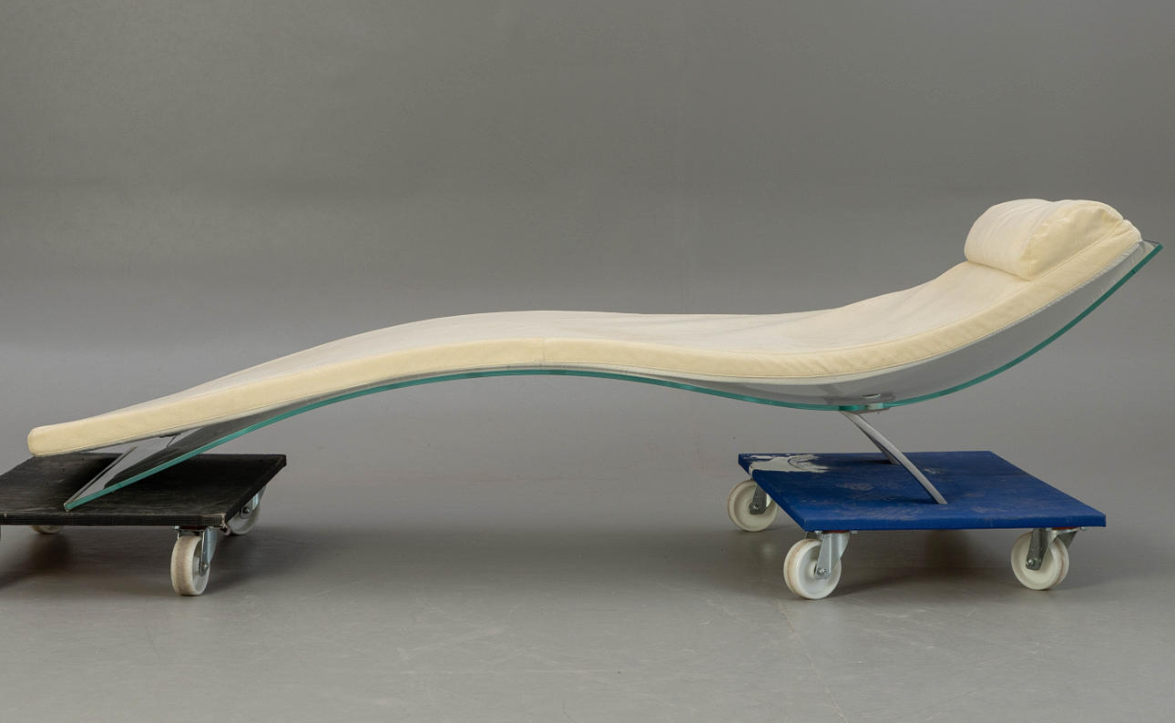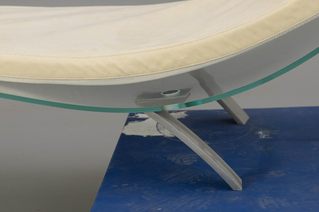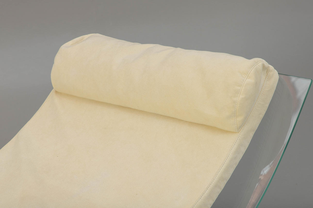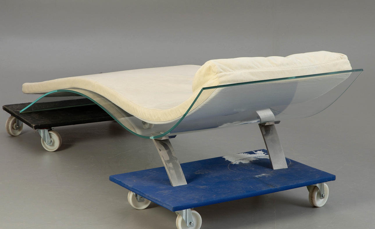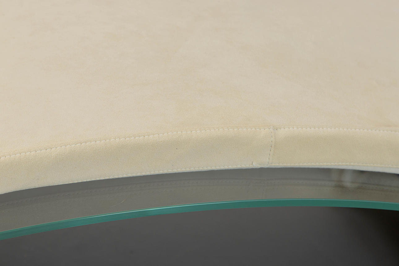 glas, metallram, krämvit Alcantara kudde, BxDxH: ca. 190 x 70 x 48 cm.