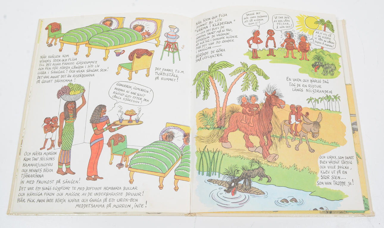 - BARNA HEDENHÖS RESER TILL EGYPTEN. Tillägnas min dotter Monne Kristina. 22 opaginerade sidor med många fina teckningar i färg. Åhlén & Åkerlunds Förlags AB (Albert Bonnier), 1955. Häftat ex i originalomslagen, Första upplagan! -Samma, andra upplagan. Tr i GDR. Bonniers Juniorb. Ngt nött. 20,5 x 25,5 cm.