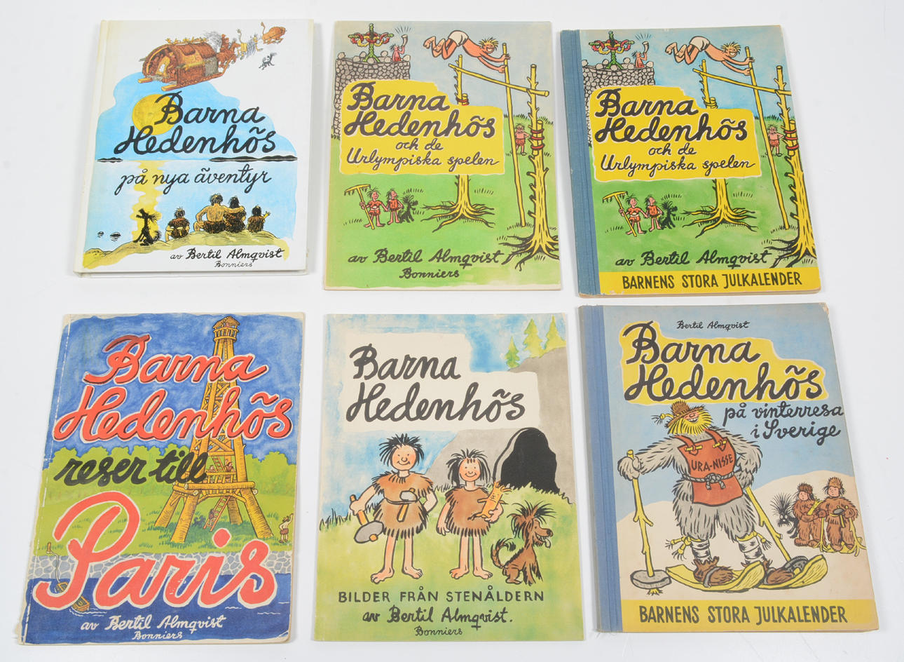 - BARNA HEDENHÖS och de Urlympiska spelen. Tillägnas Sven Hampus och Christer Salén. 23 opaginerade sidor fulla med ”Bertilas” underbara teckningar. Allt i färg. Bonniers 1952. Första upplagan!