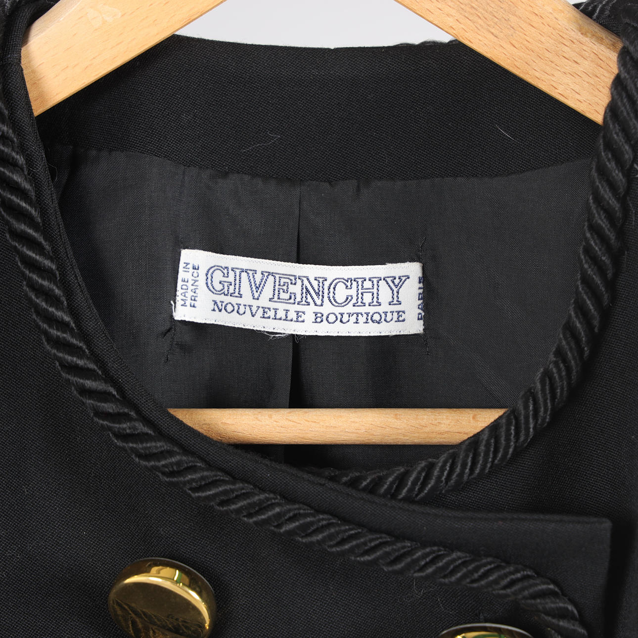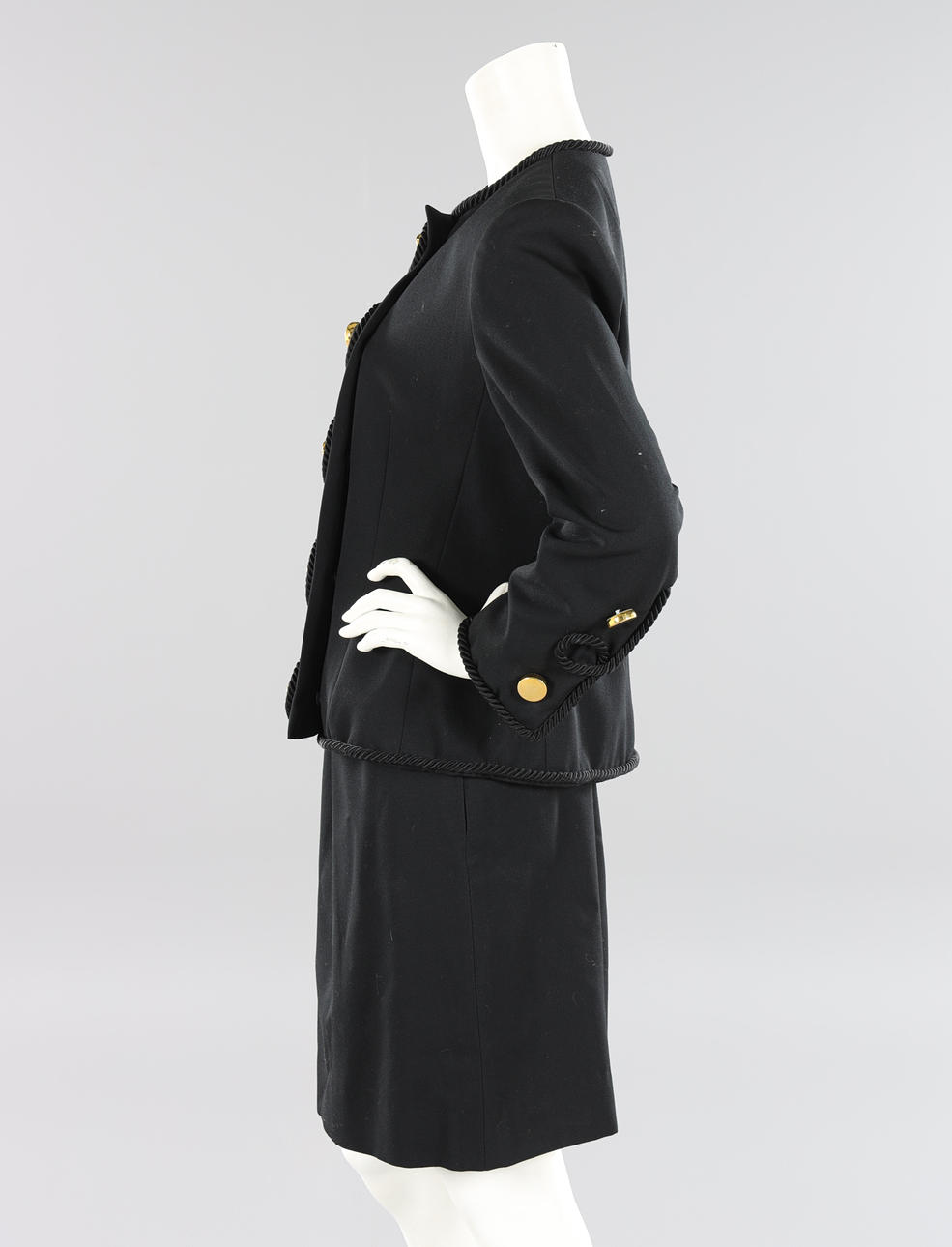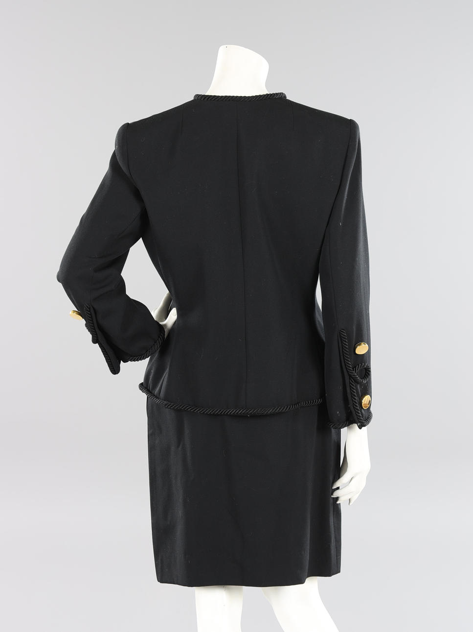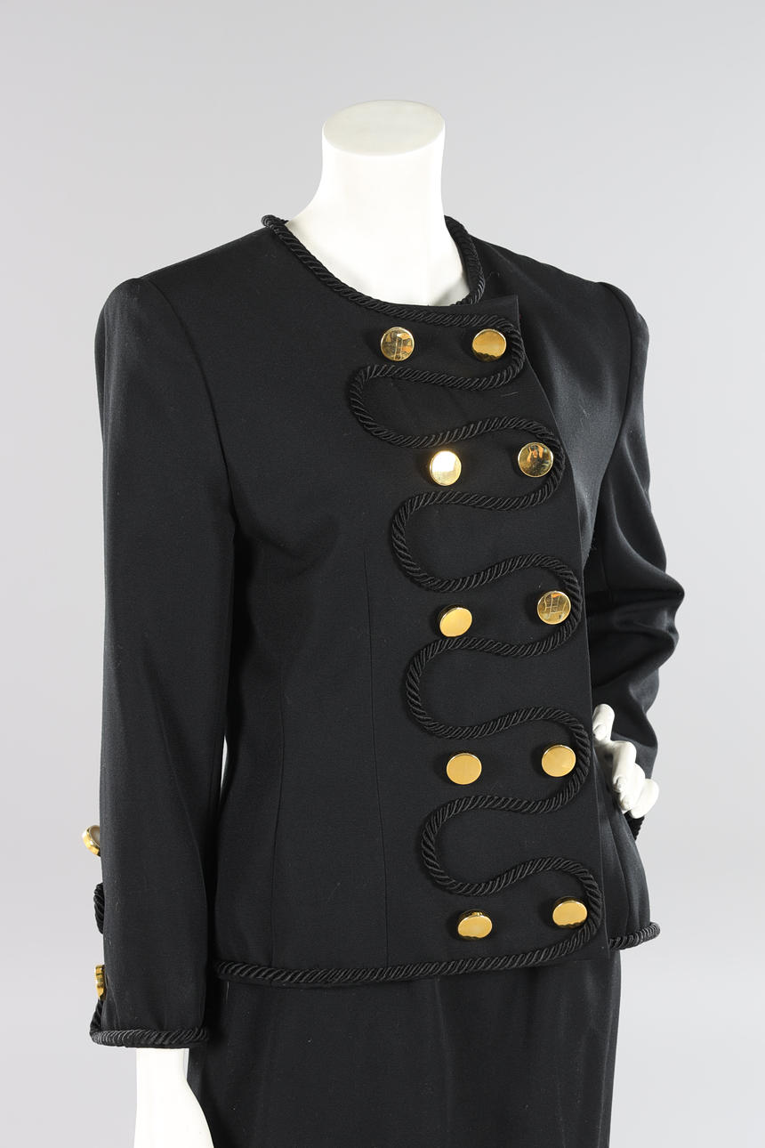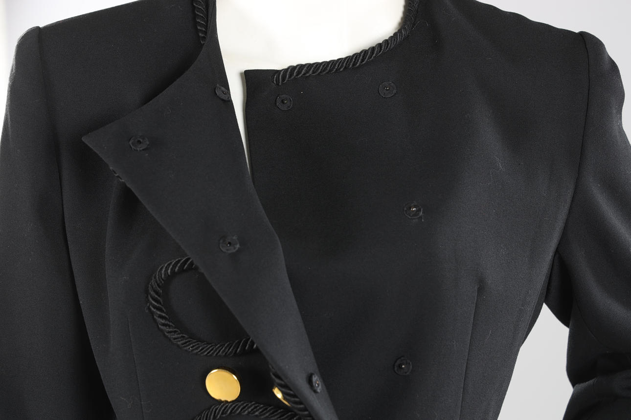 Dubbelknäppt kavaj i svart ulltyg med rund halsringning, guldfärgade knappar med snörapplikation. Knäppes med tryckknappar. Uppskattad storl ca 38/40. Bystvidd ca 100 cm. Rygglängd ca 60 cm.