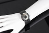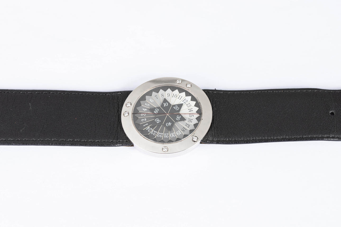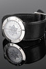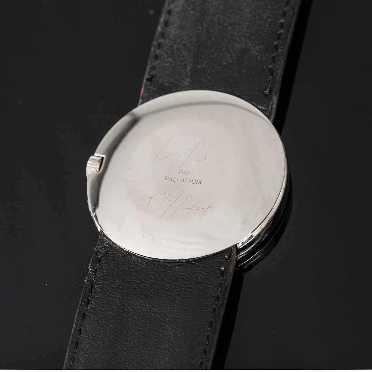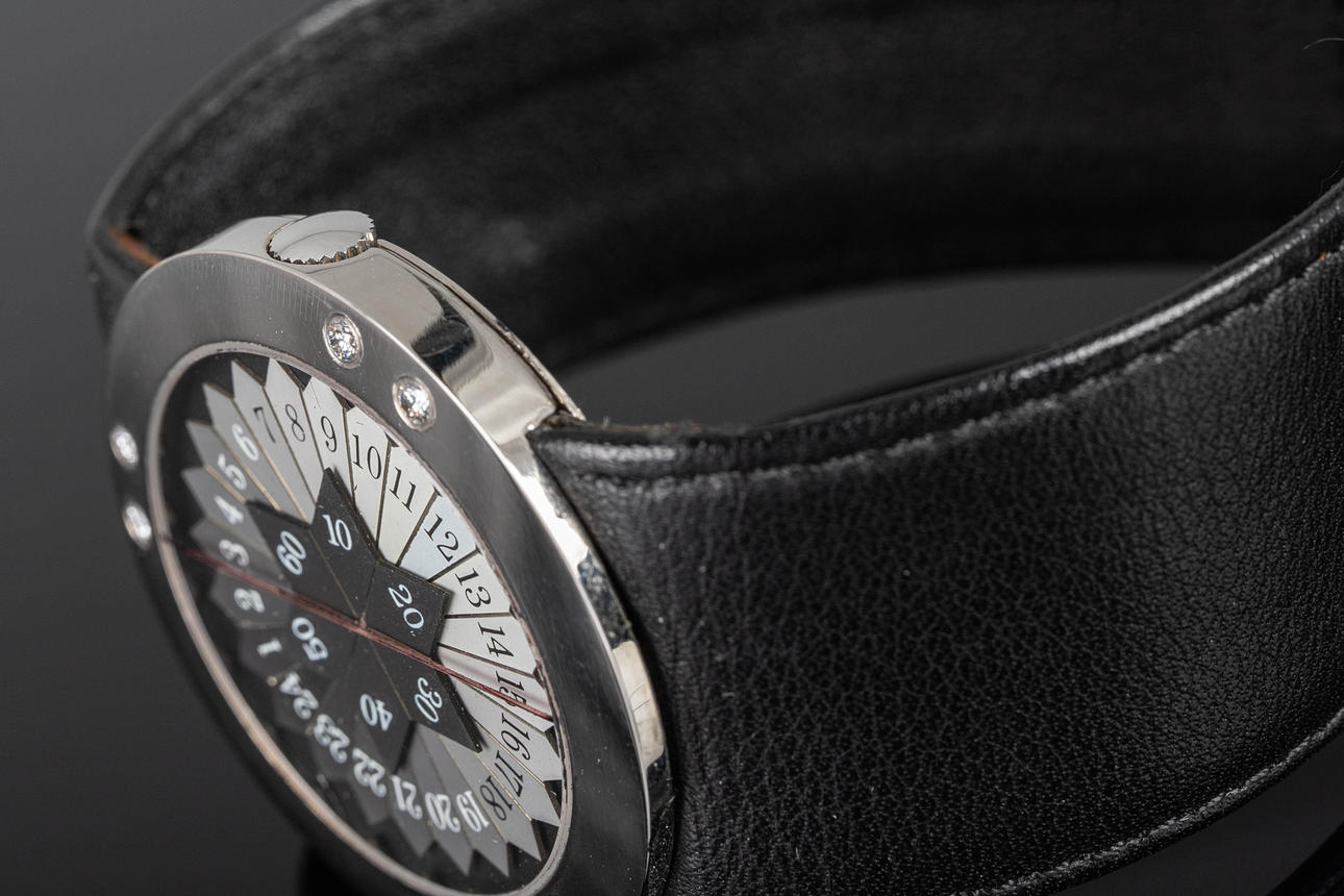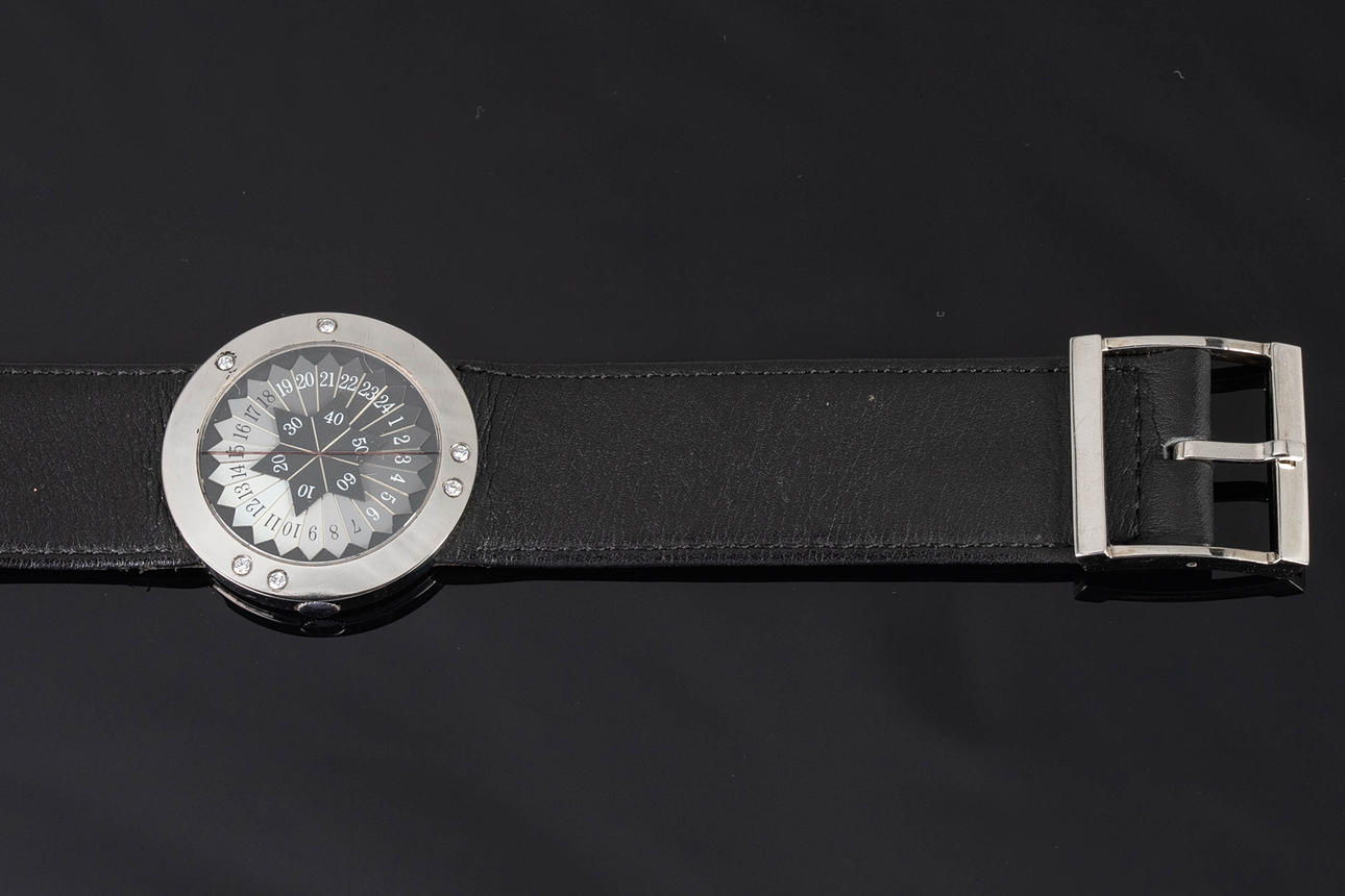 Wolf Peter Schwarz armbandsur, modell: 'Light Clock' limited edition Nr 87 av 144. Väska av palladium, översållad med diamanter totalt ca.. 0,12 ct, gråvit urtavla med timme- och minutvisare. Läderrem med palladium spänne. kvarts arbete. Fodralet diameter ca.. 35 mm Vid tidpunkten för granskningen var klockan igång; Stockhoms Auktionsverk garanterar inte funktionalitet.