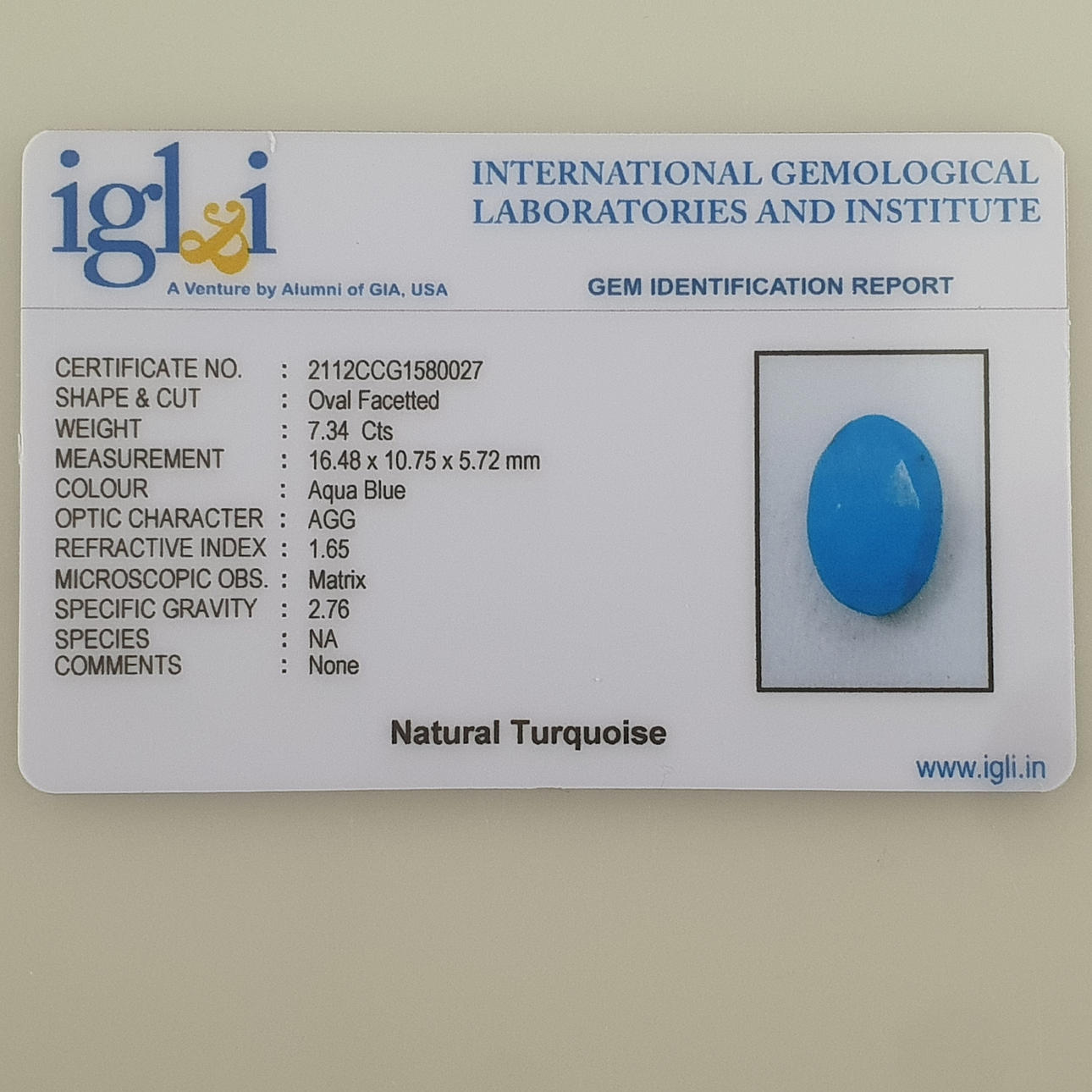 7.34 ct Turkos, Storlek: 16,48 x 10,75 x 5,72 mm, IGLI Certifierad.