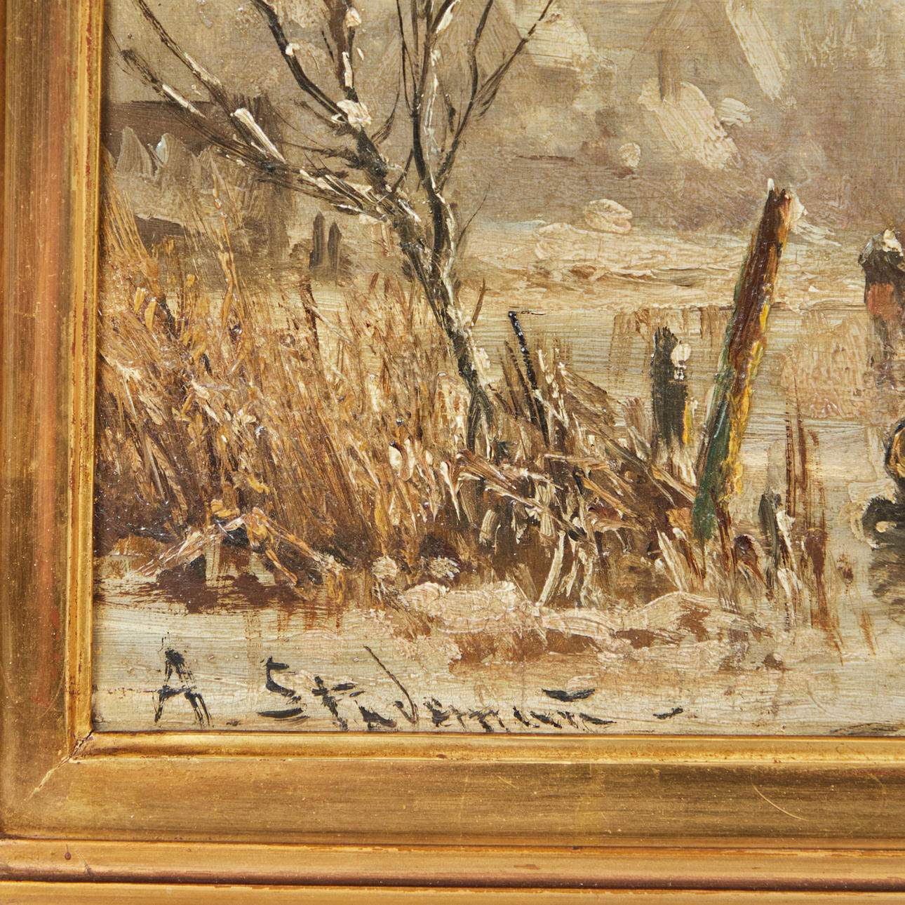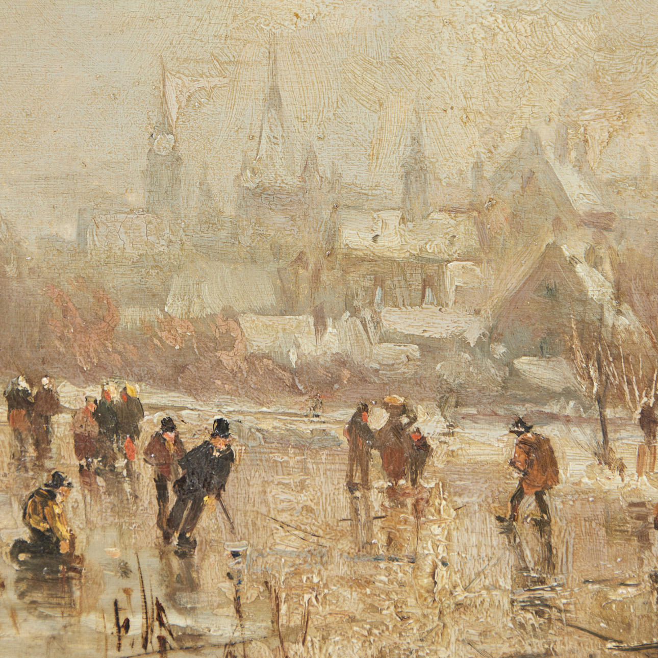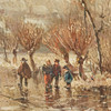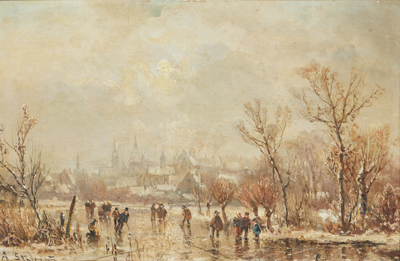 Adolf Stademann (1824-1895), målning, vinterlandskap, olja på trä. Skildring av ett vintrigt exteriör med flera figurer på en isig sjö med en stad i bakgrunden, signerad längst ner till vänster, 34x52cm (57x75cm).