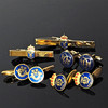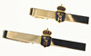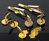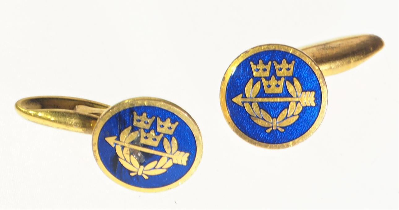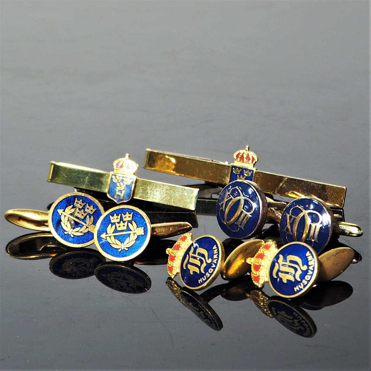 Två slipsnålar, längd 6,5 och ca 5 cm Tre par manschettknappar, två par stämplade Sporrong.