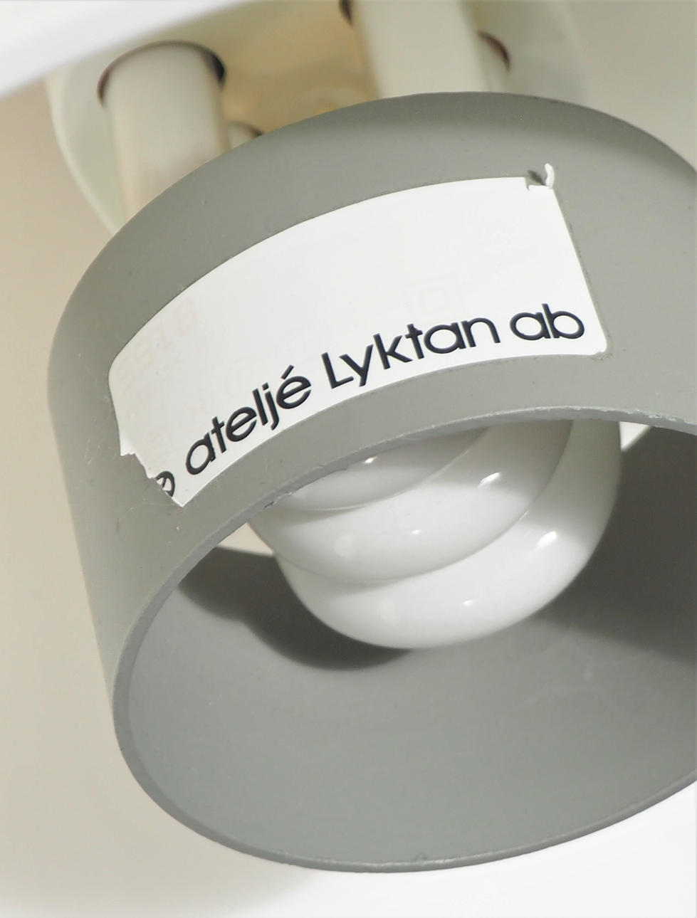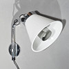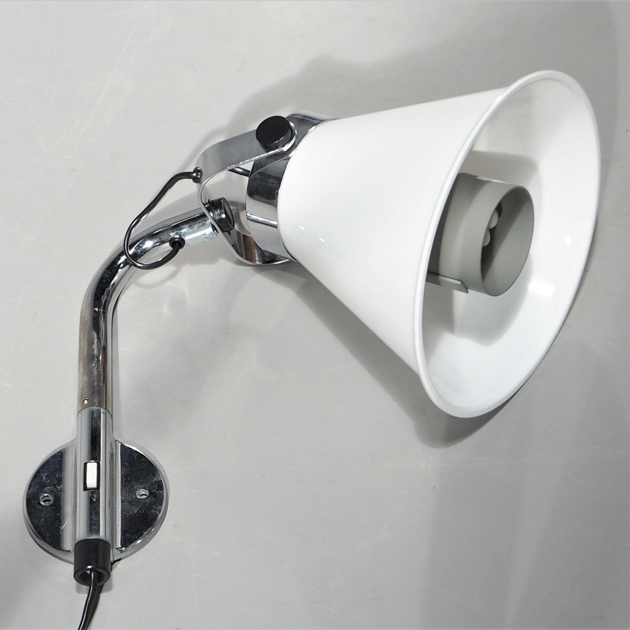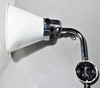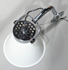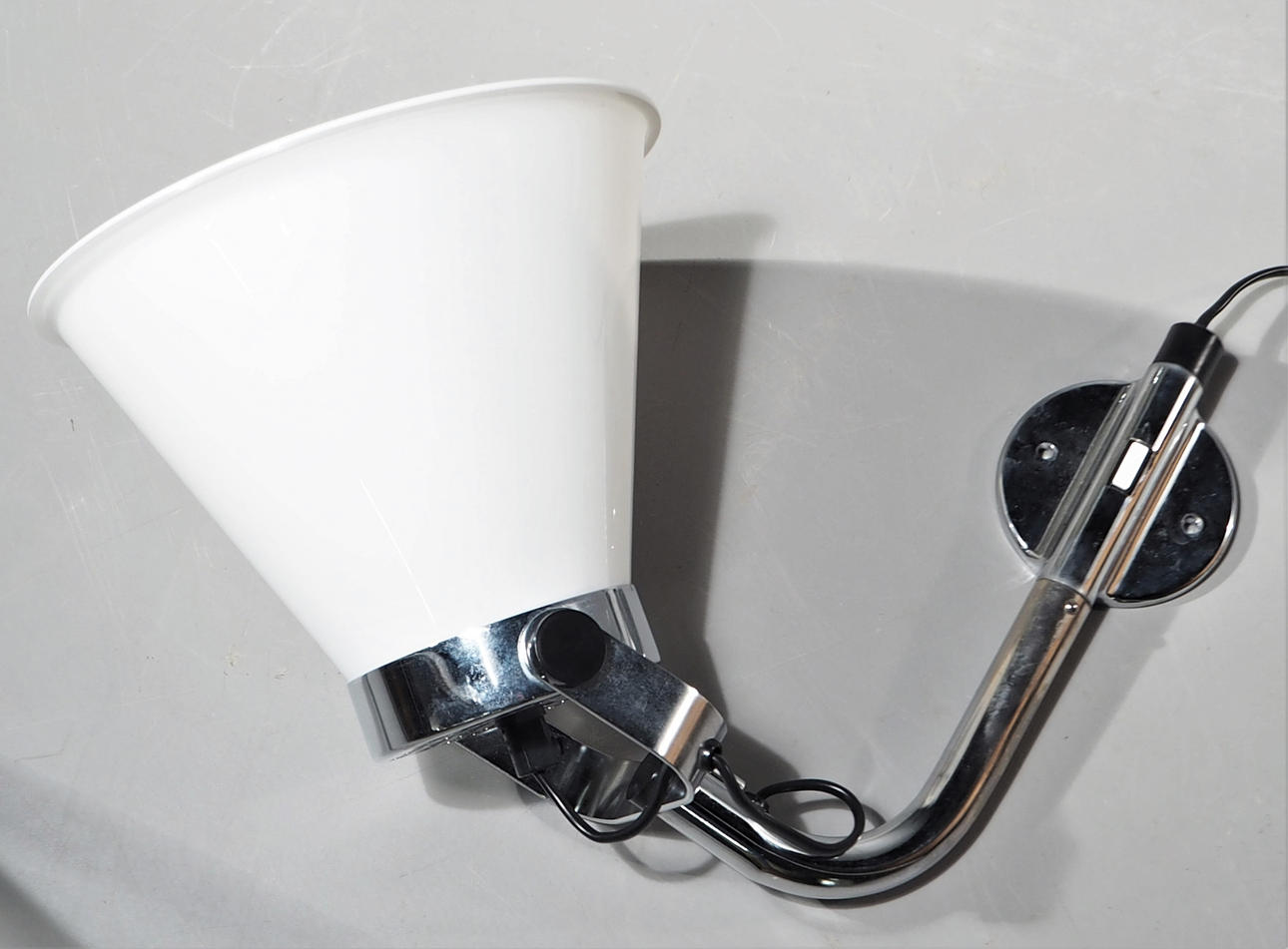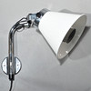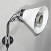 Rostfritt väggfäste, skärm i vit plast. Höjd ca 35 cm, djup från vägg ca 35 cm, skärmens diameter 22 cm.