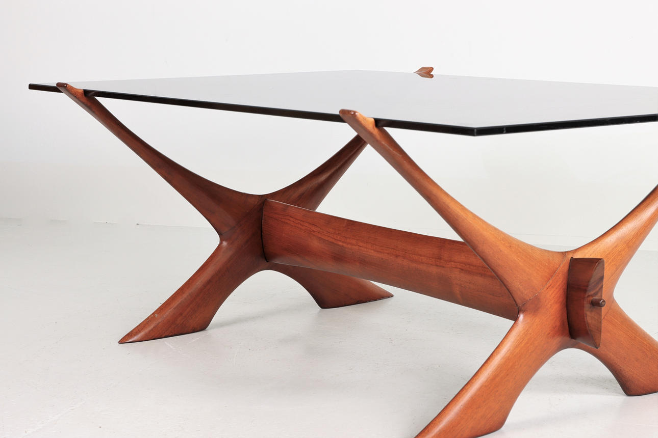 Soffbord,1960/70-tal, underrede i teak, rökfärgad glasskiva, fasettslipad Höjd 53 cm Skivans mått 135 x 87 cm.