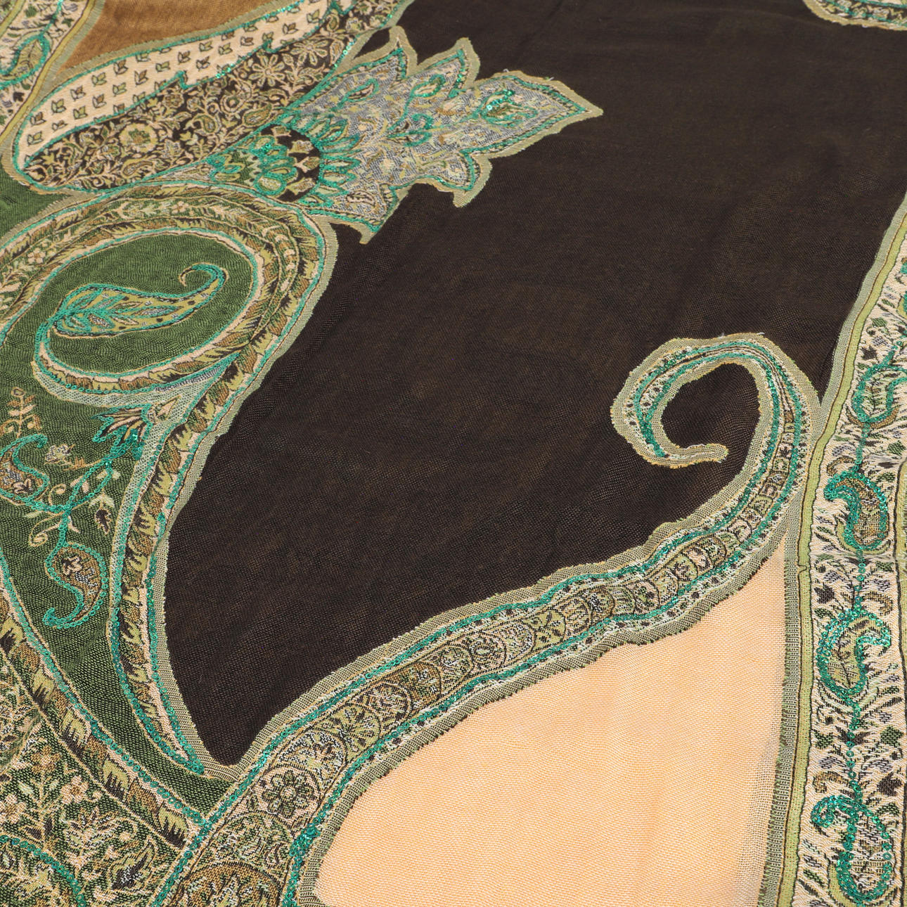 Brun sjal med gröna toner och strass, 205 x 70 cm.