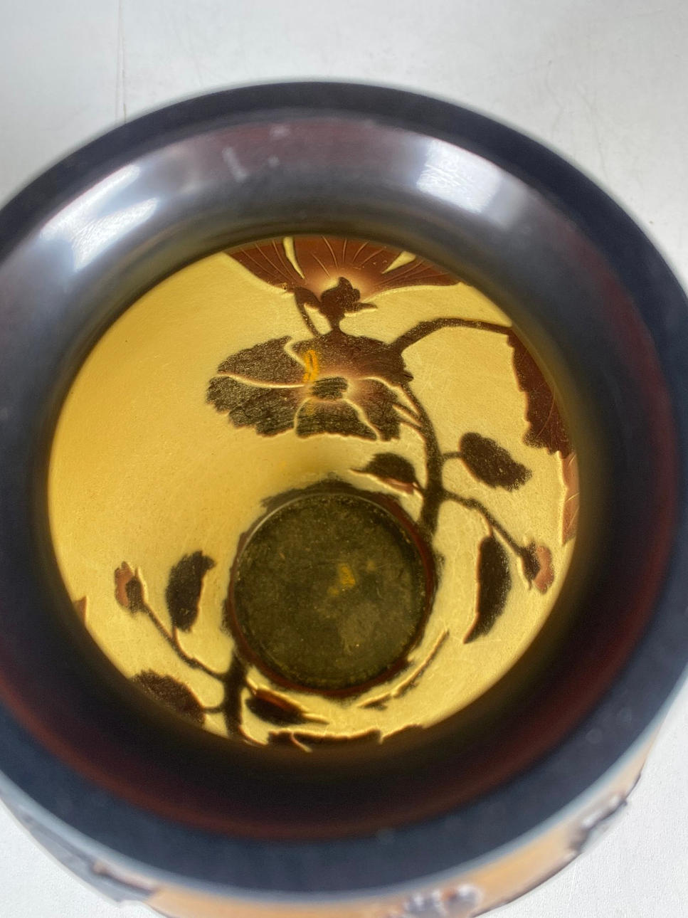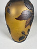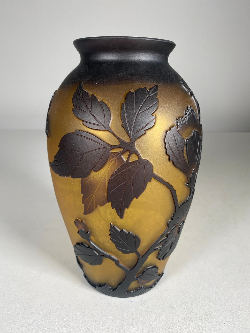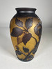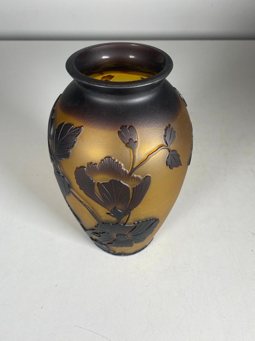 Vas med blommotiv, färglös glasvas med brun/gul överlägg och etsad blommig dekoration runt omkring.