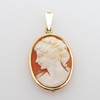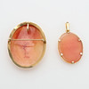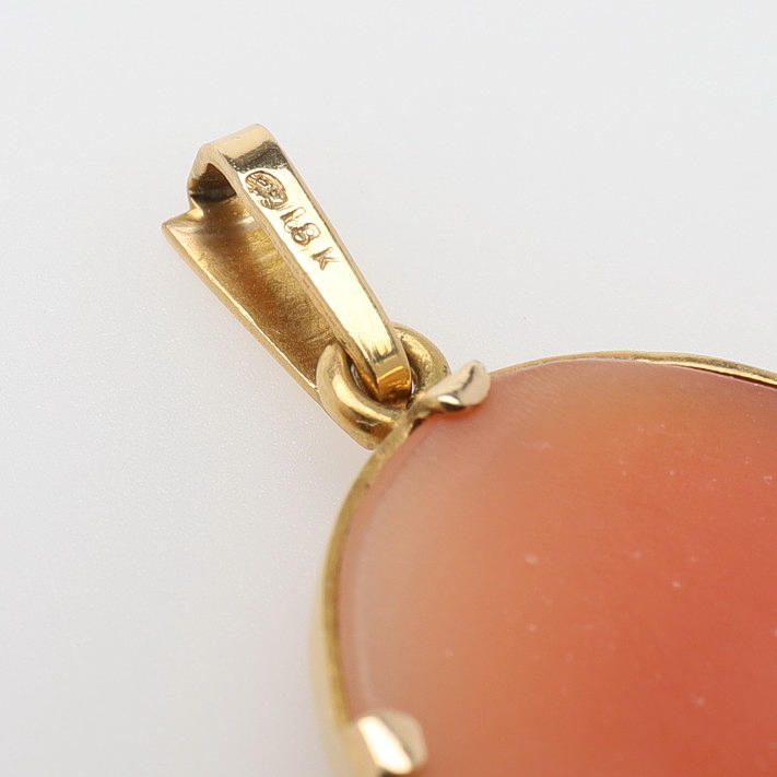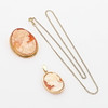 Två hängen med snäckkaméer fattade i 18k guld, den större kan även bäras som brosch, höjd 4 och 2,5 cm, vikt 9,9 gram samt pansarkedja av 14k guld, längd 47 cm, vikt 3,7 gram.