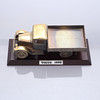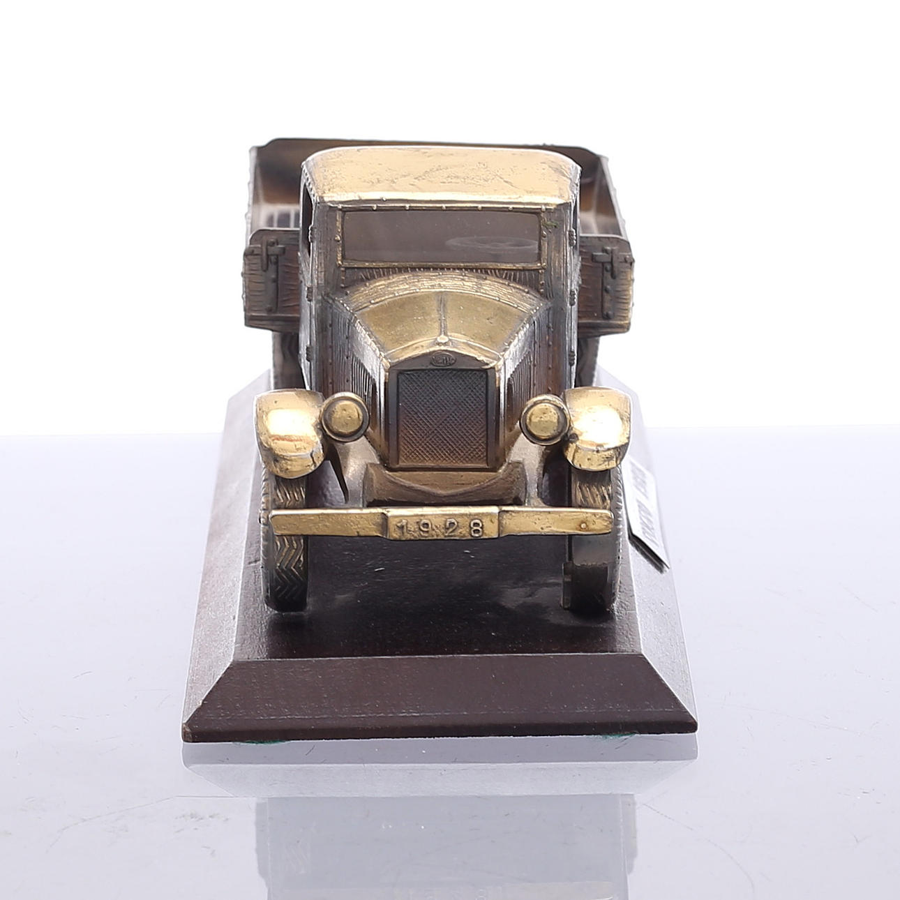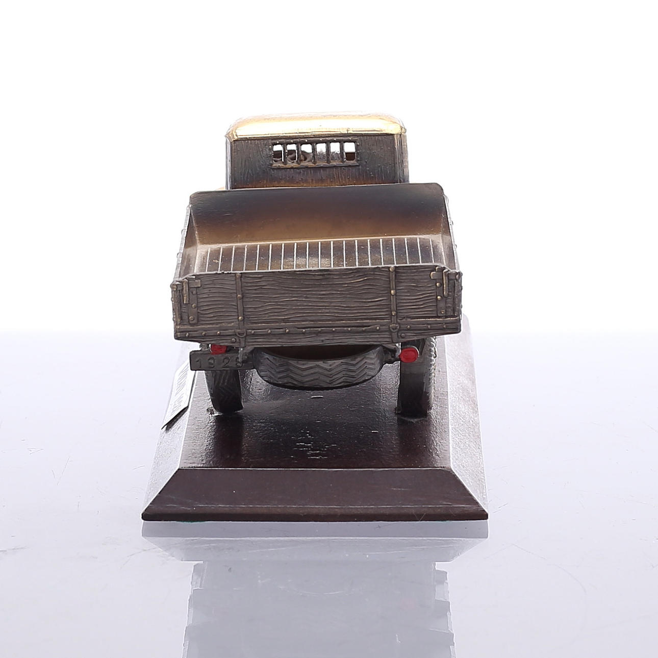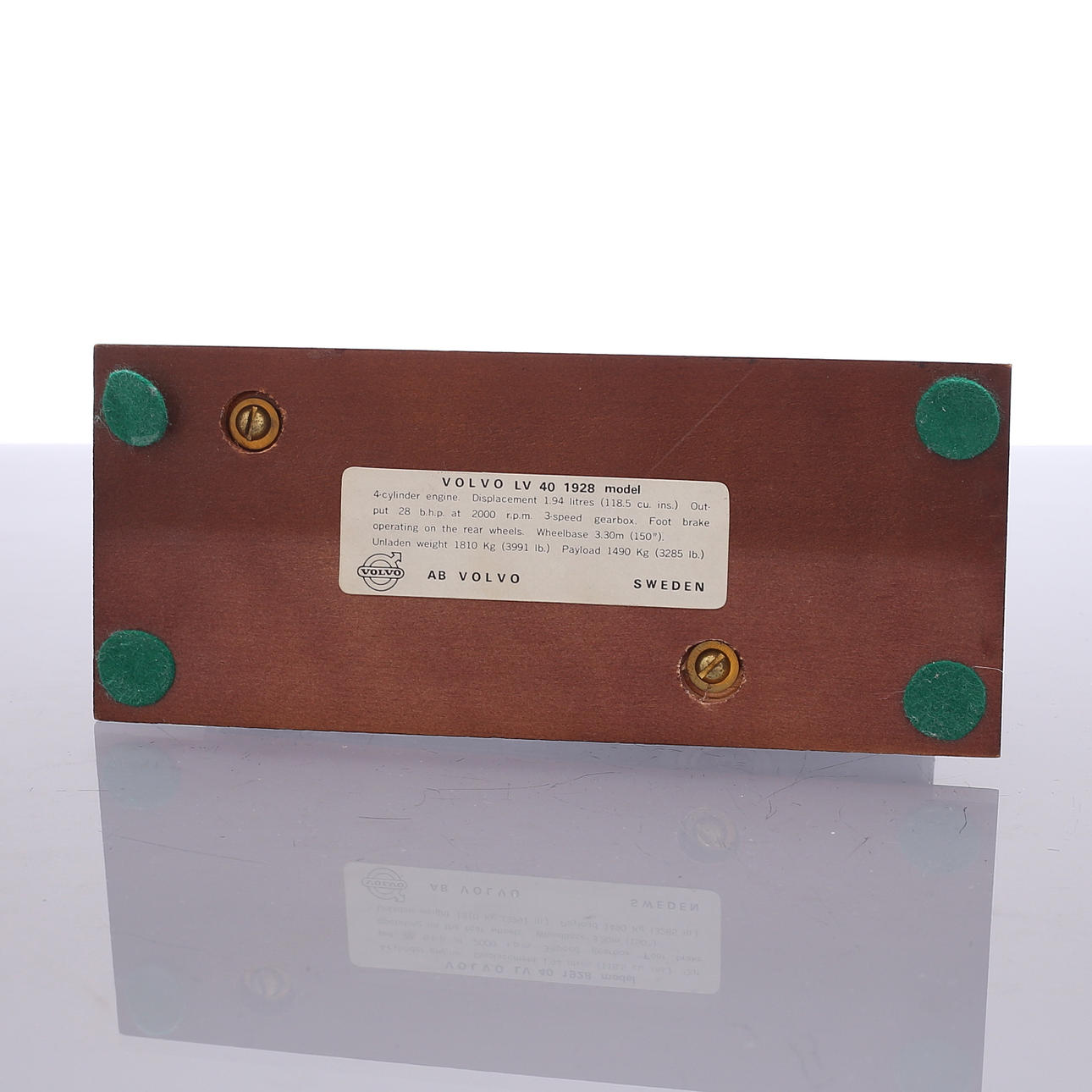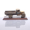 Lastbil i metall på träsockel, utgiven av Volvo ca 1950-tal. Längd 17,5 cm, höjd 6,5 cm.