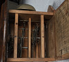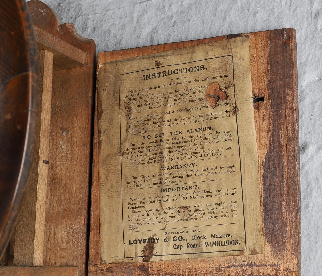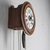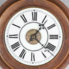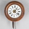Den 7" vita urtavlan med romerska siffror, i gjuten ek boett, slående på en ringklocka, 28cm diam..