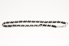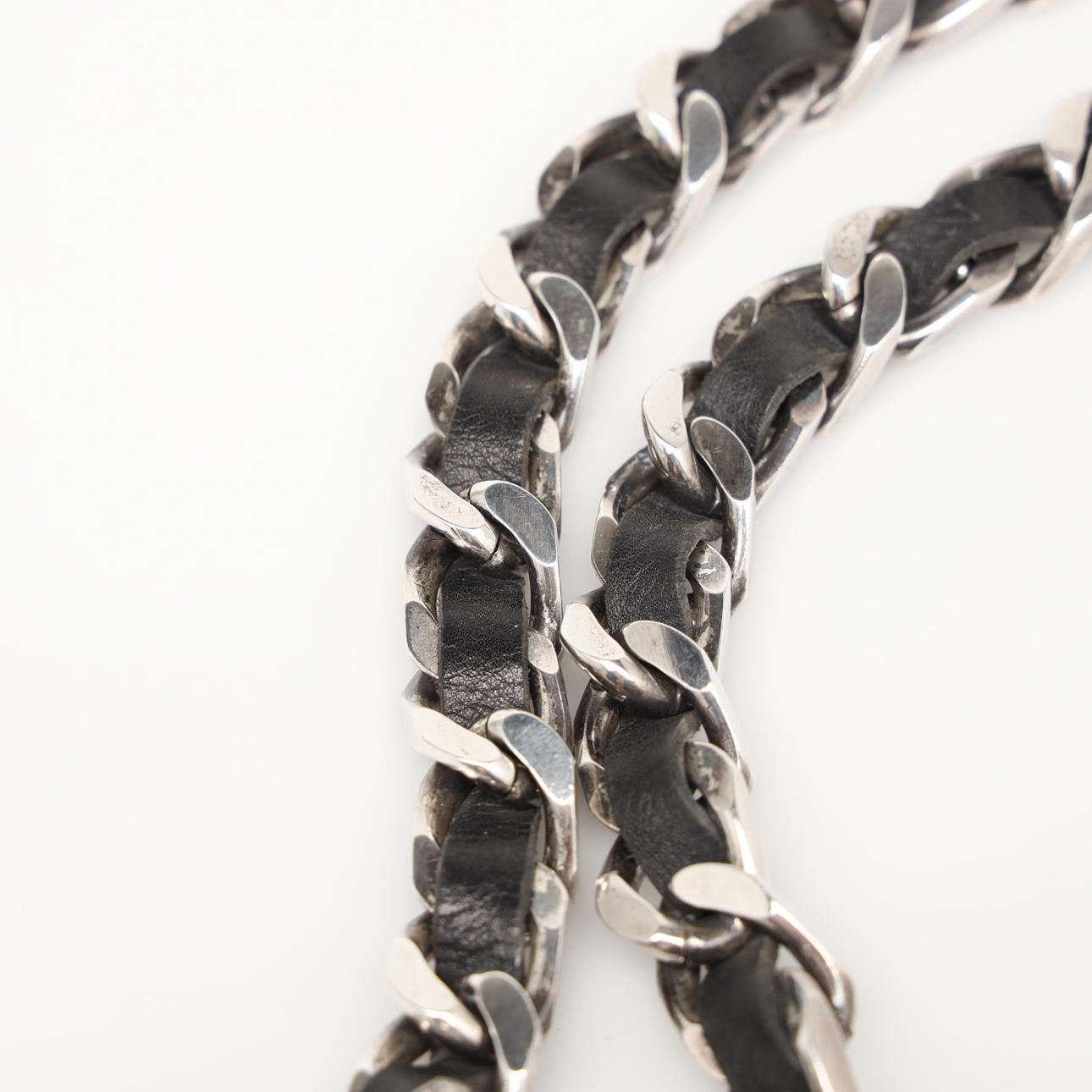 Kedja i vitmetall med svart läder. Längd ca 80 cm.