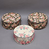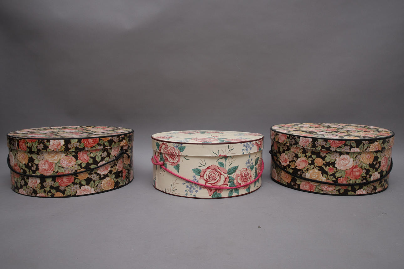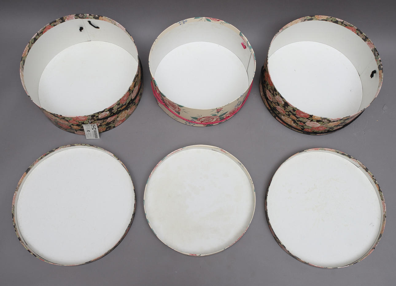 Stora askar, 2 st, höjd ca 15 cm, diameter ca 36,5 cm. Liten hattask, höjd ca 14 cm, diameter ca 33,5 cm.