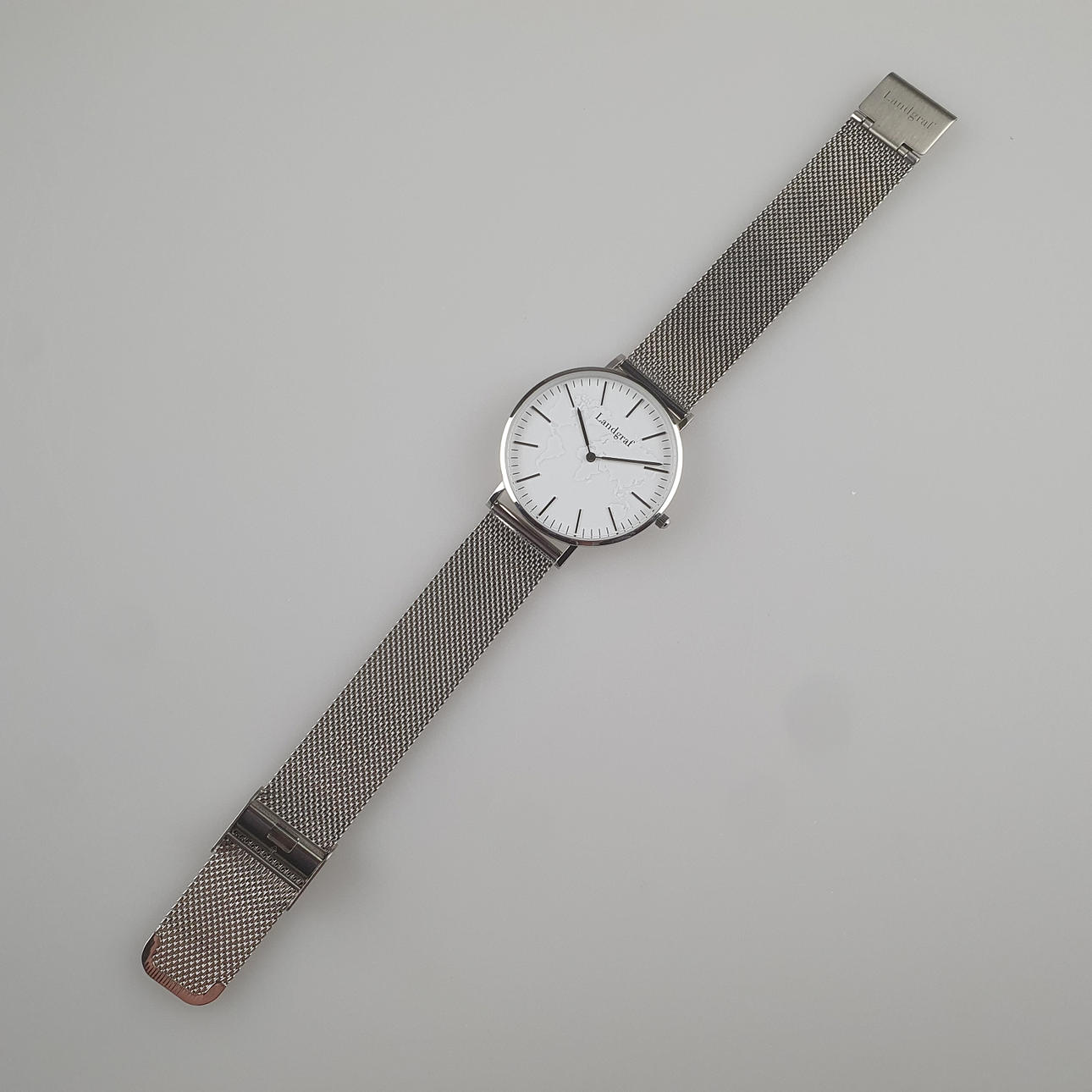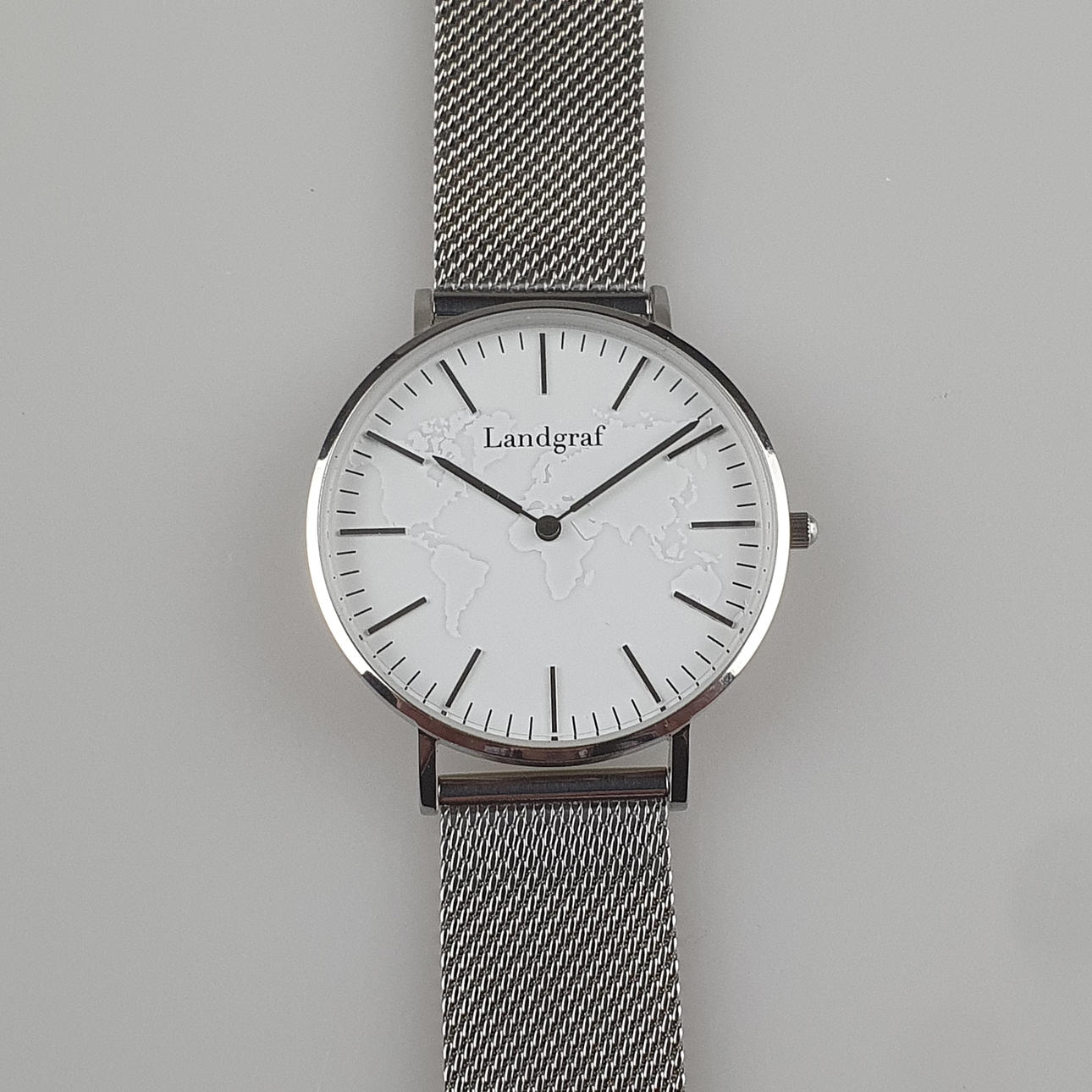 Landgraf, WORLD EDITION SILVER WHITE, graverad världskarta, mesh metallänk, schweiziska kvarts urverk, 38mm, repor och splittersäkert safirglas.
