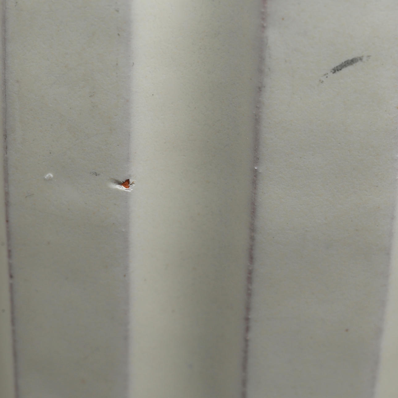 Bruksslitage. Fläckar, märken, krackeleringar. Mindre nagg. Retuscheringar på undersida, möjligen från tillverkningen.