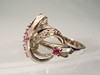 Ringhuvudet består av valv, varav några är satinerade och delvis täckta med fasetterade rubiner (7x) och vita topas (3x).