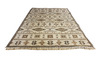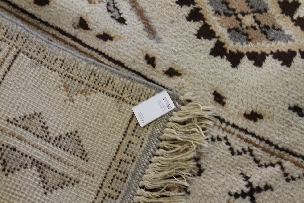 Geometriskt mönster i brunt, blått och grått mot crèmevit botten. 305 x 197 cm.