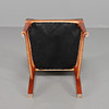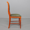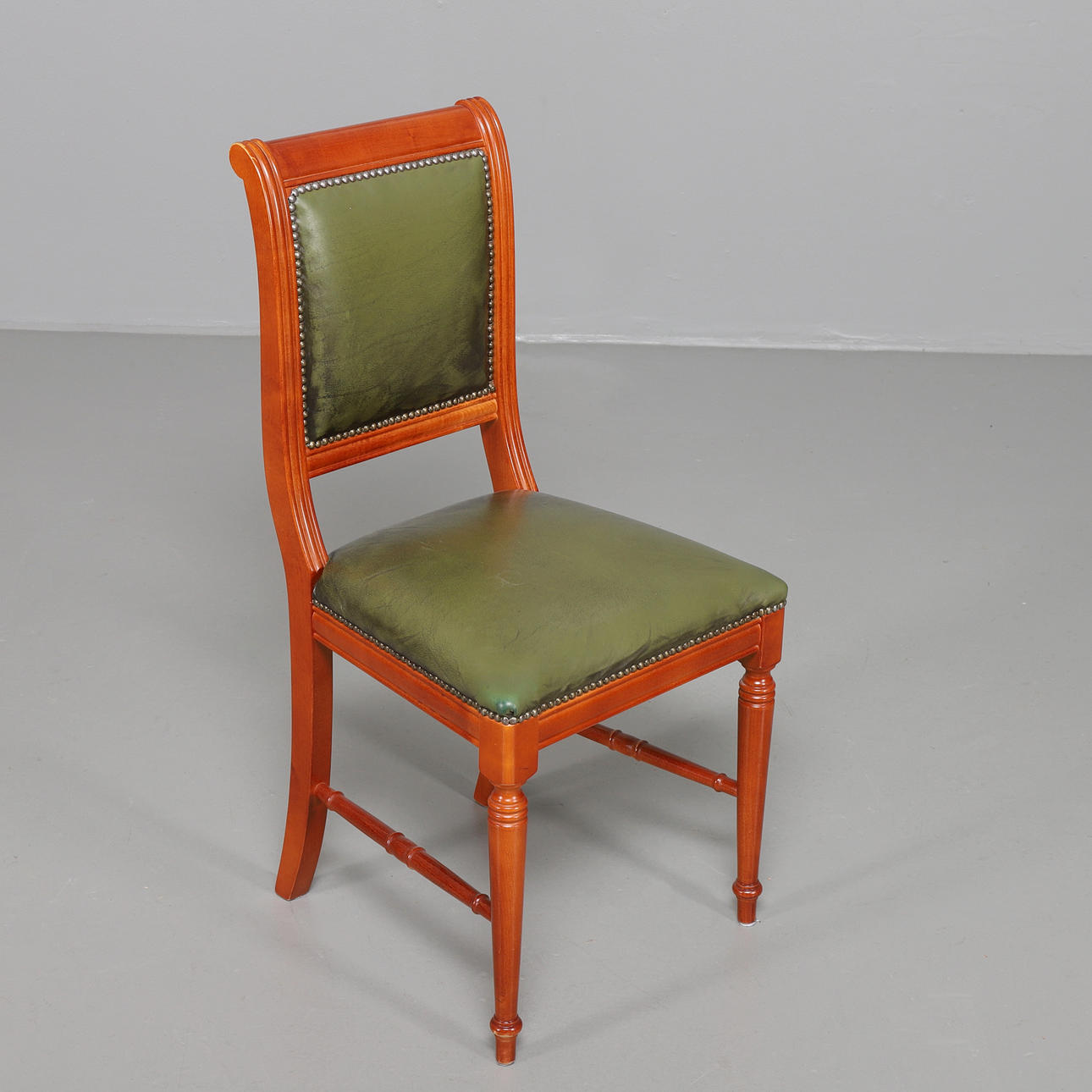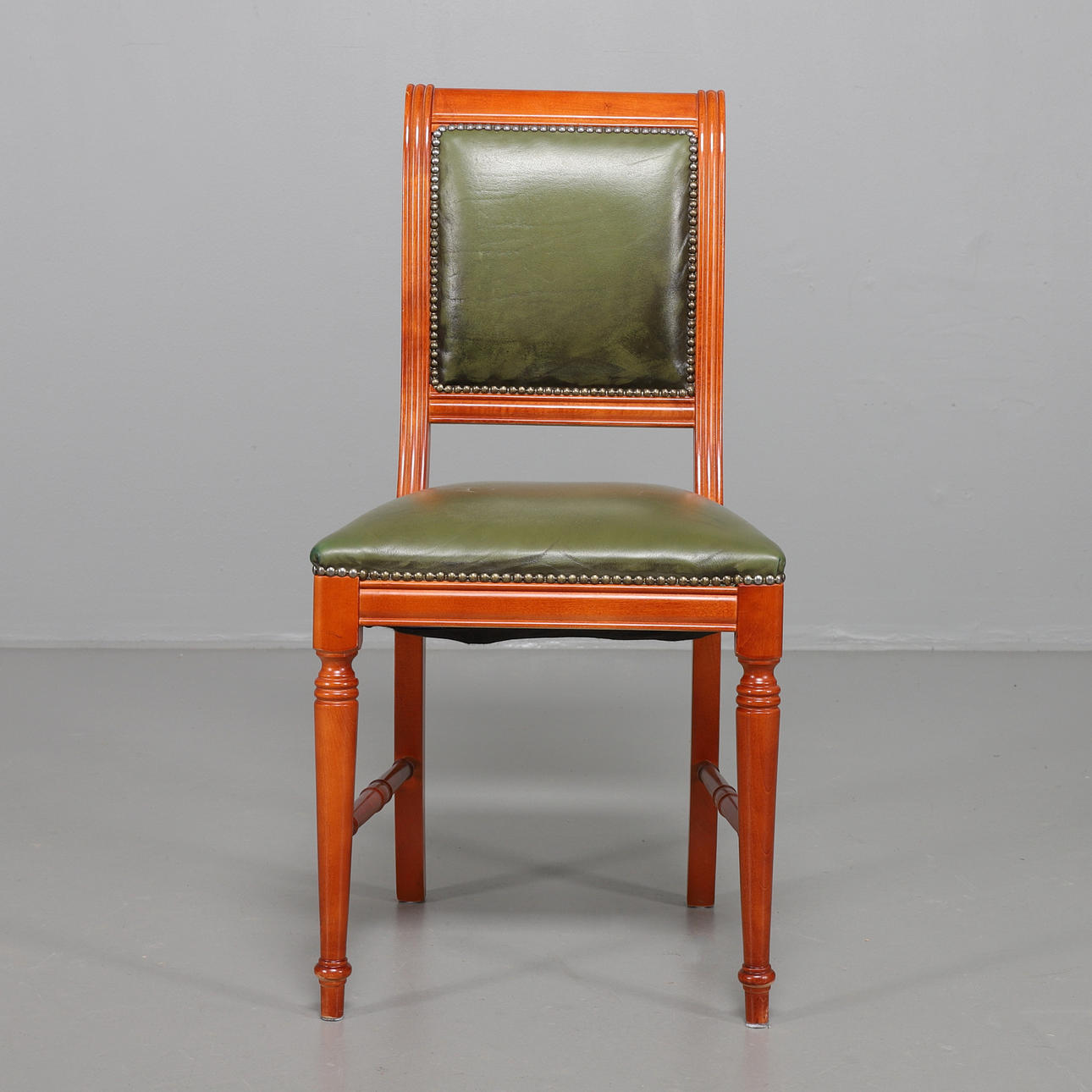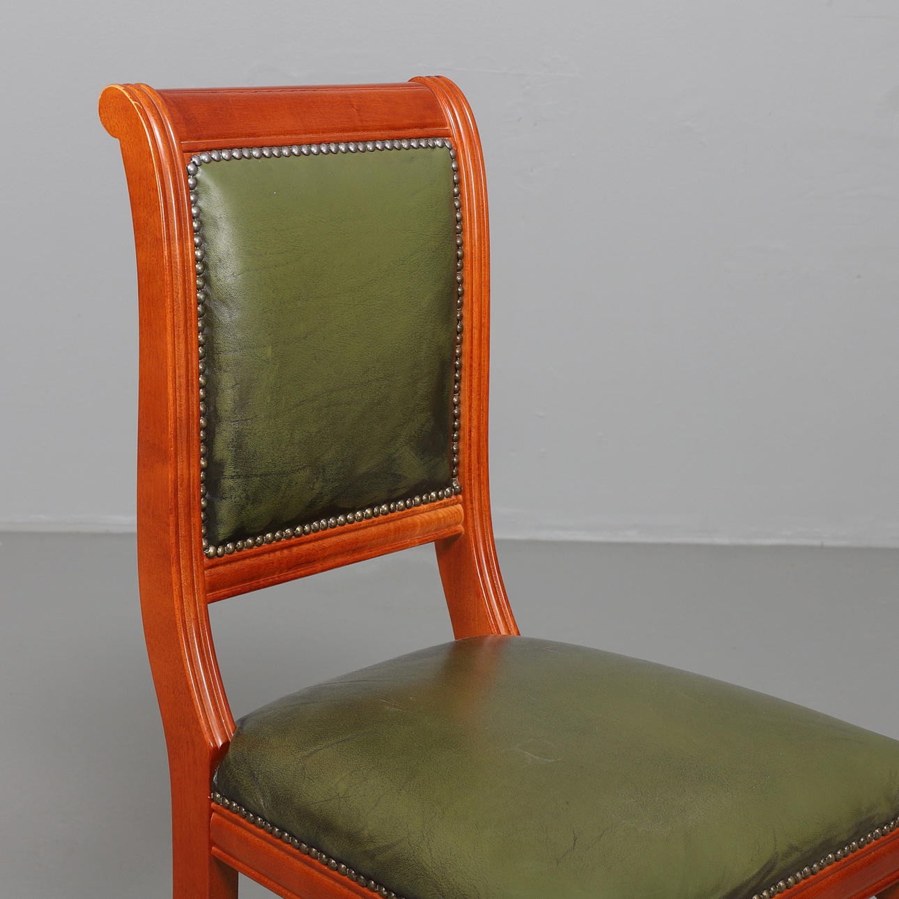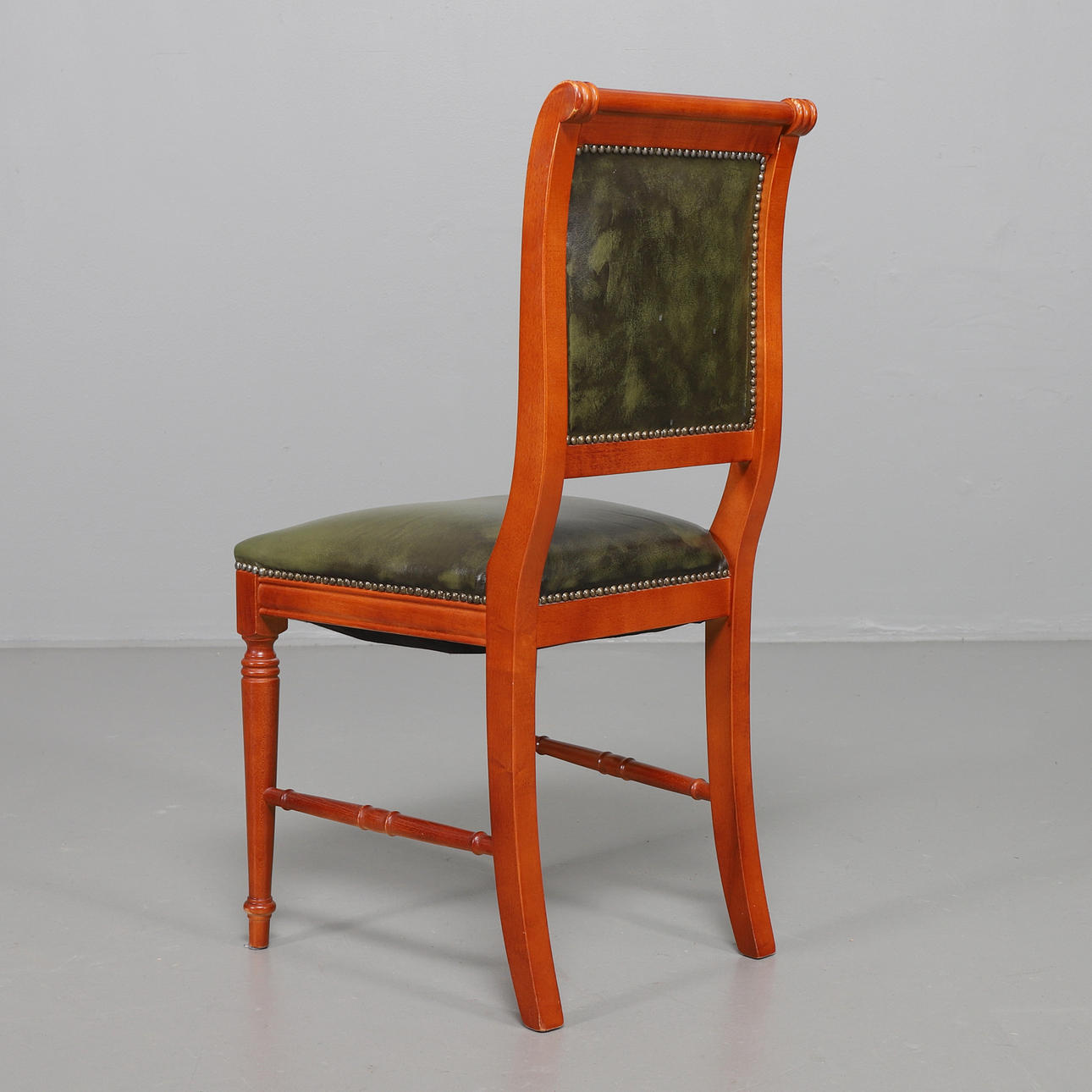 Stol med stomme i rödbonad bok, stoppad sits och ryggbricka klädda i grönt läder, med pärlspiksdekor.