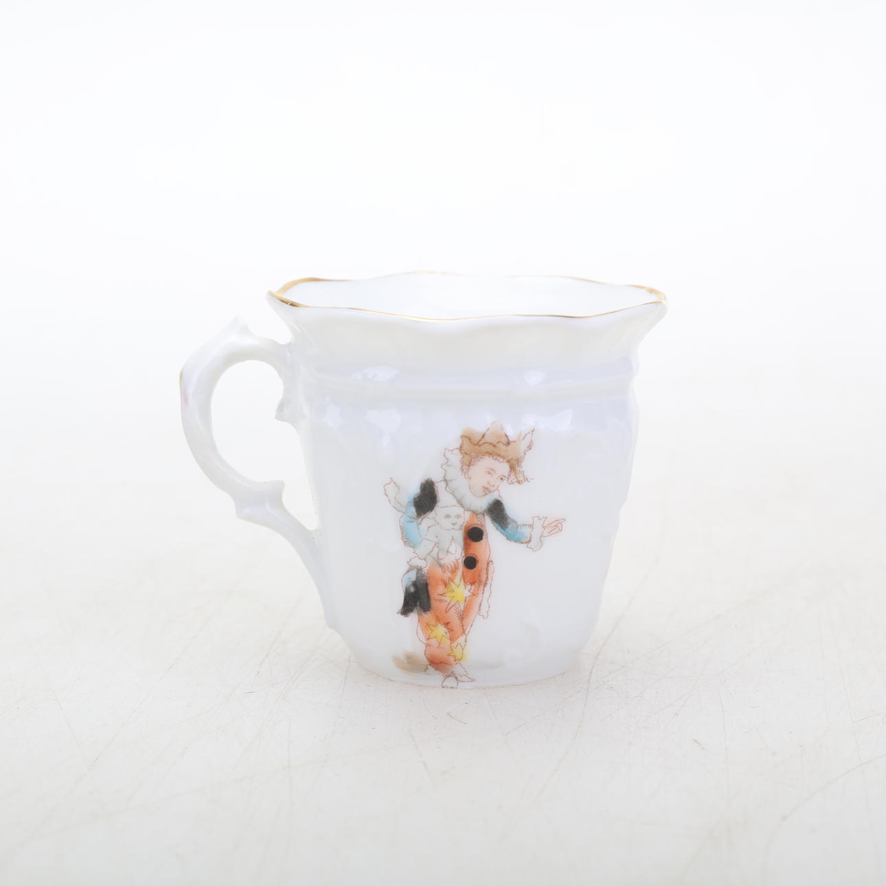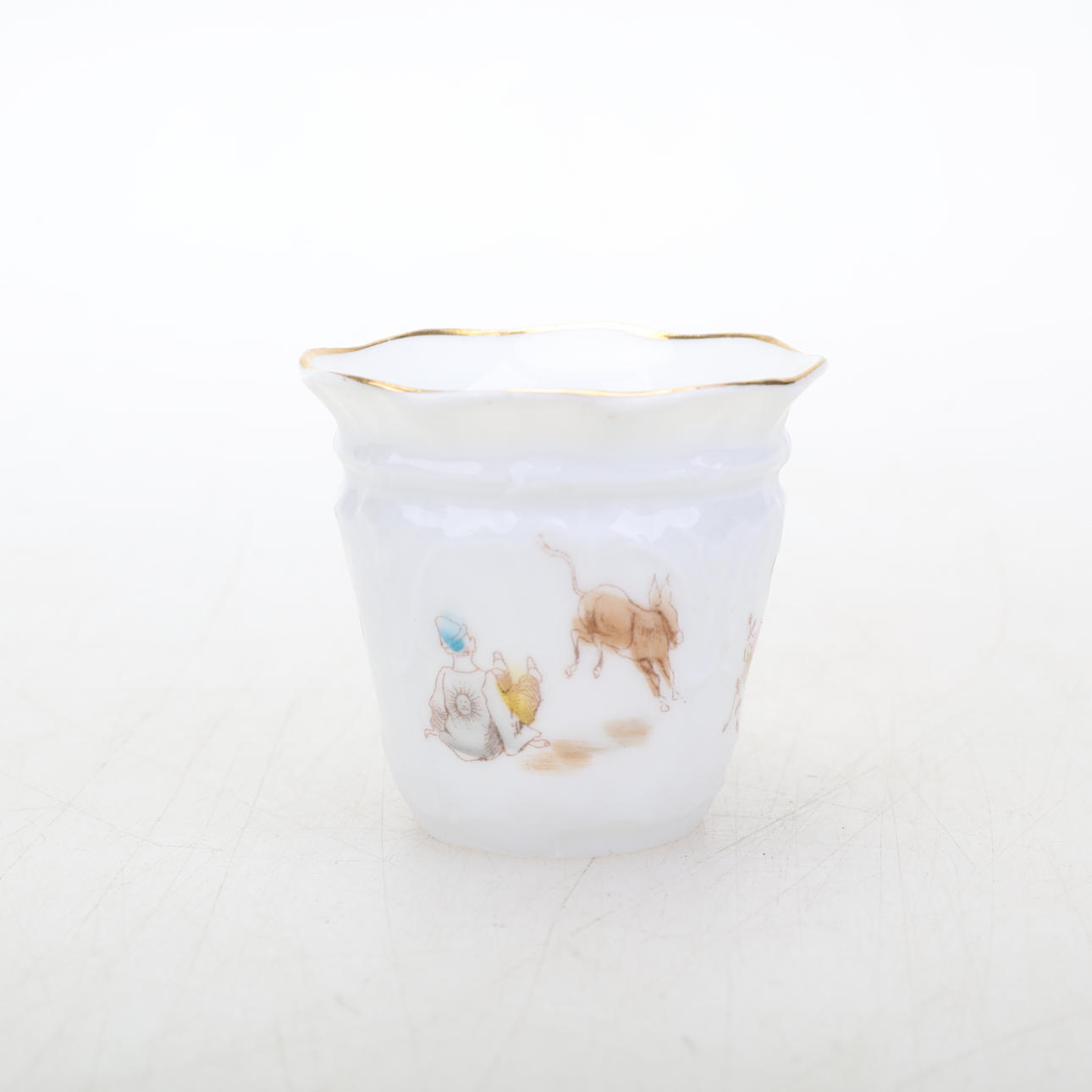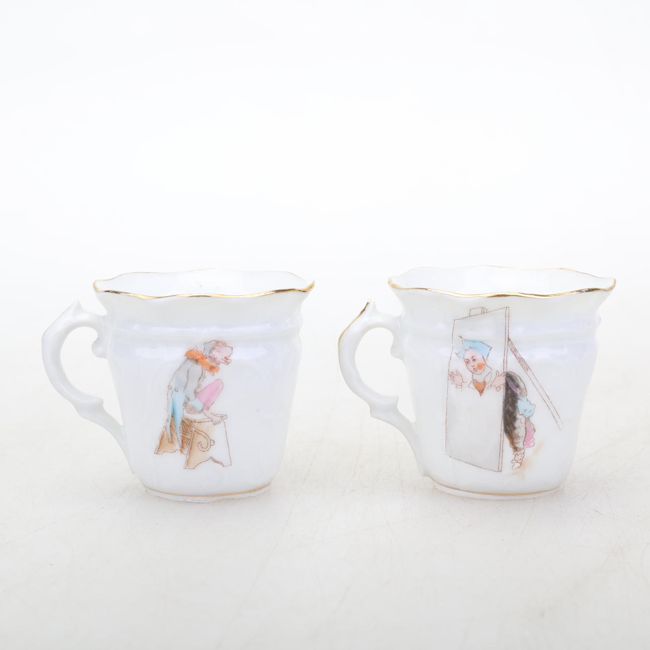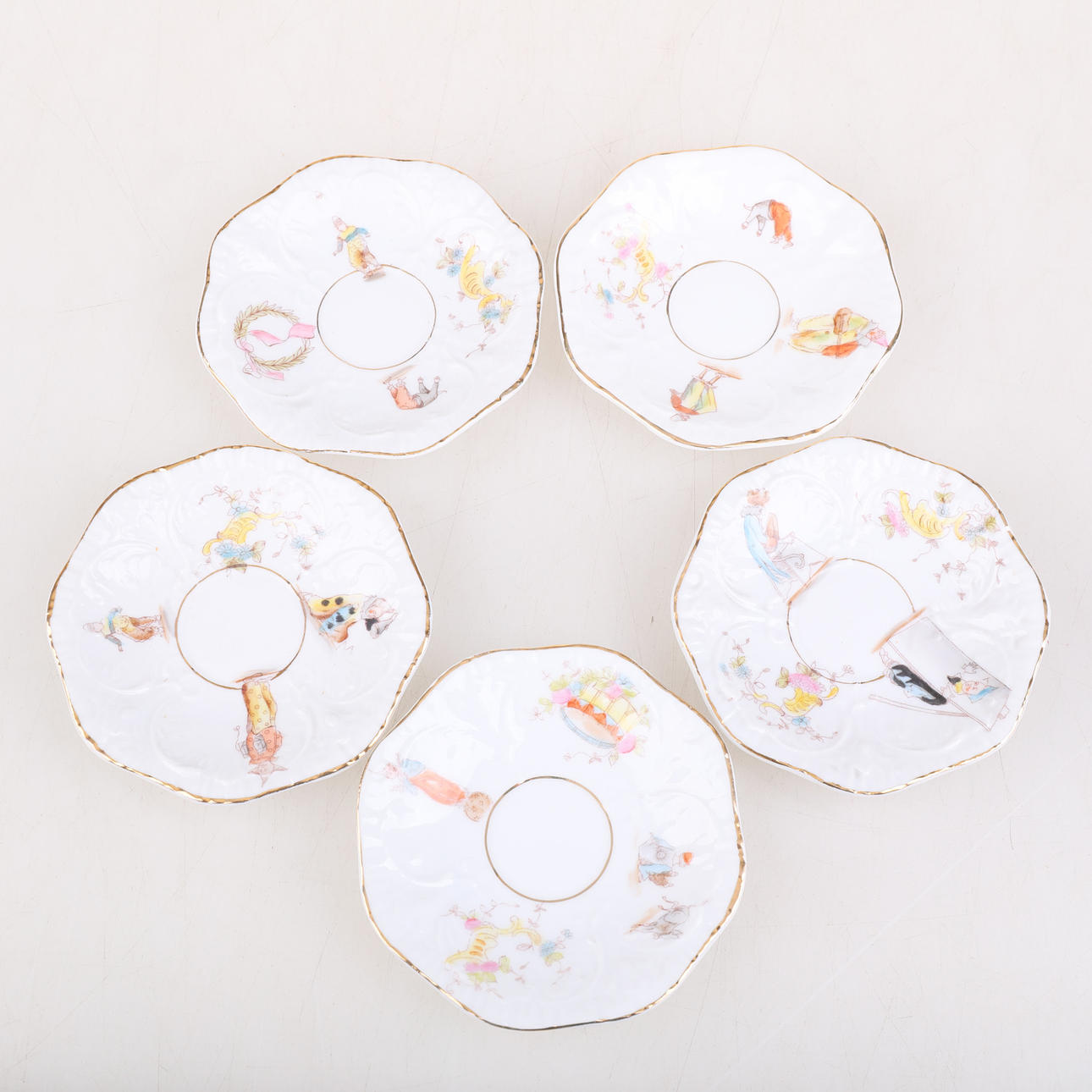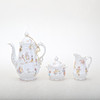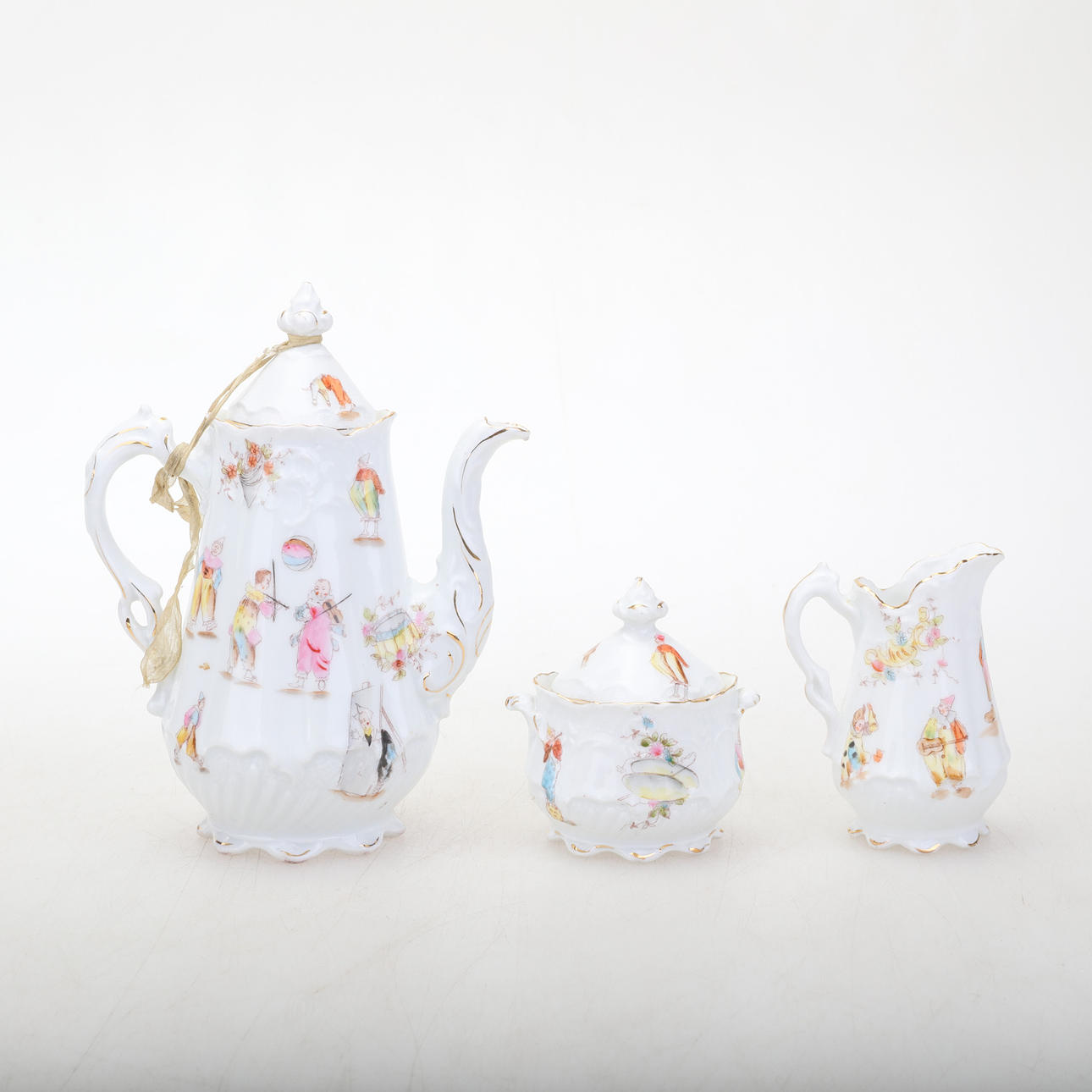 1 st kanna höjd 5 st fat ca ø 10 cm 5 st koppar ca ø 5 cm, 5 cm hög 1 st gräddkanna och 1 st sockerskål.
