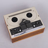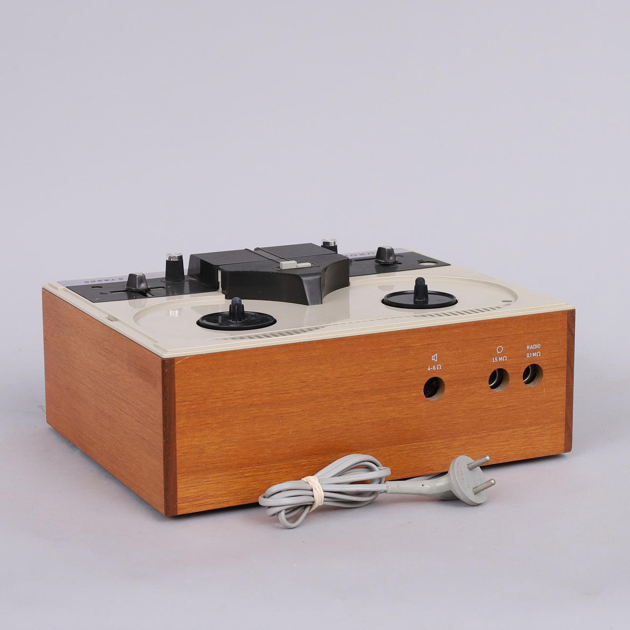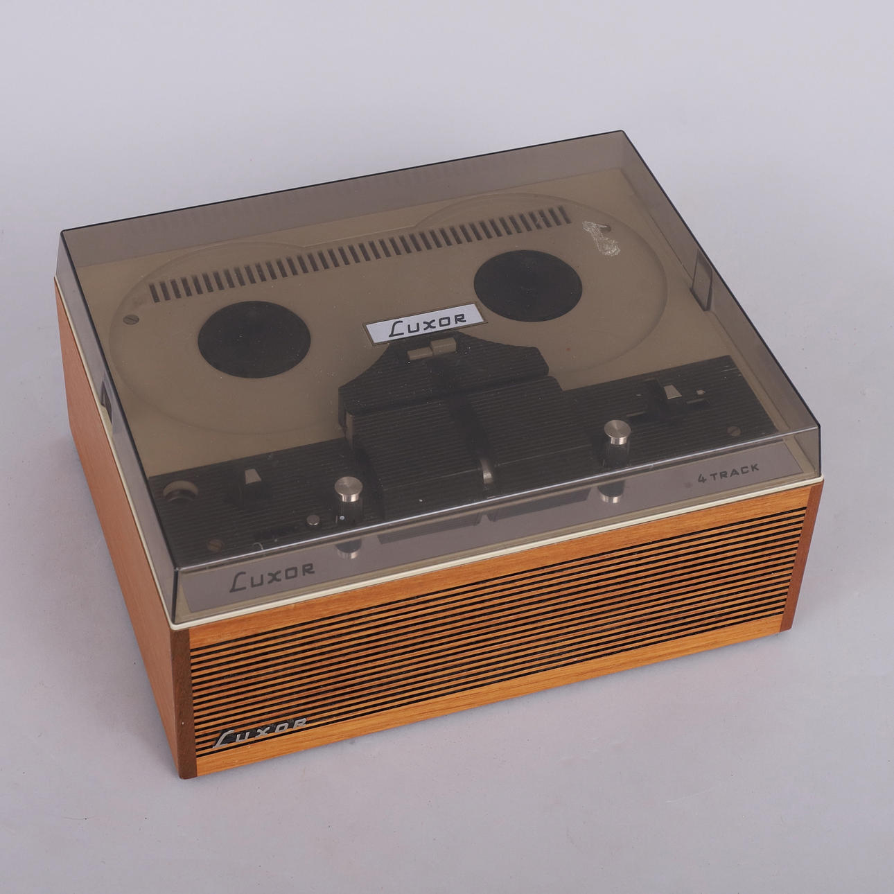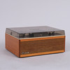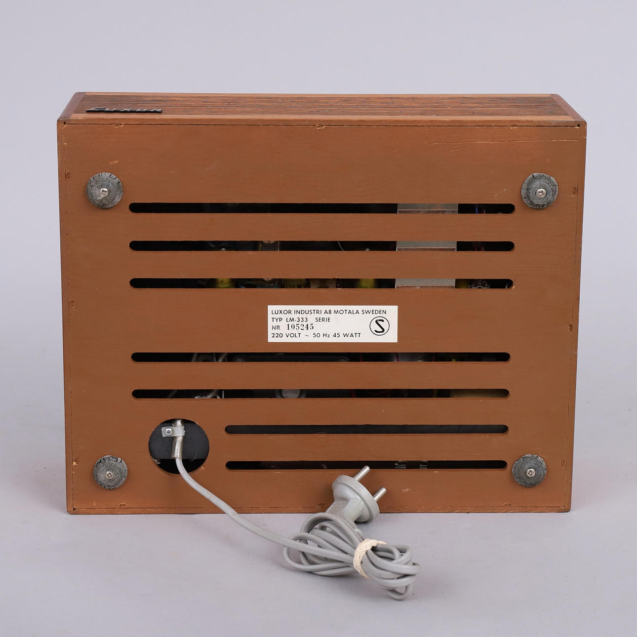 Luxor LM-333 med kabinett i plast och teakfanér. Mått: bredd 34, djup 27, höjd 15,5 cm.