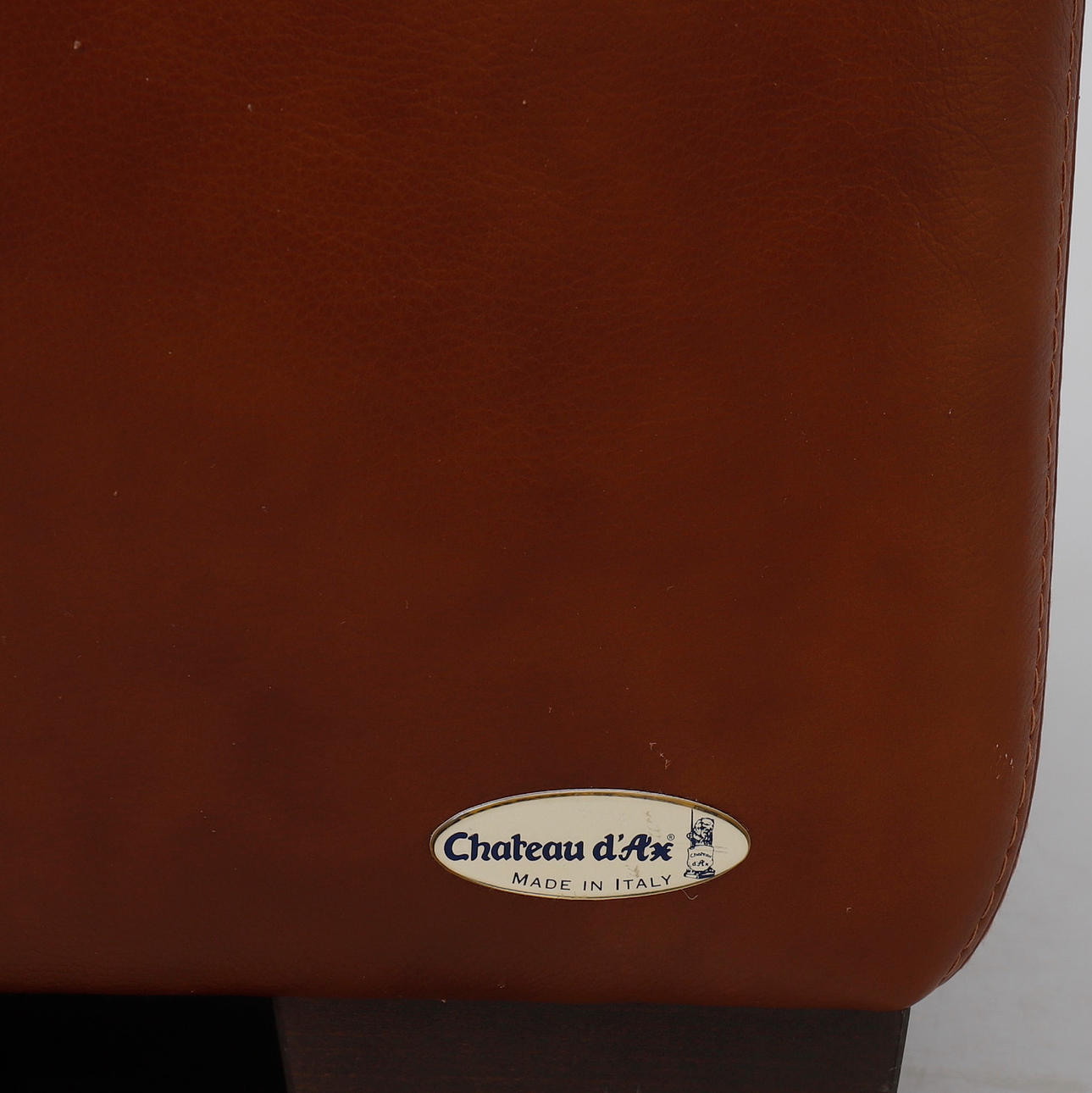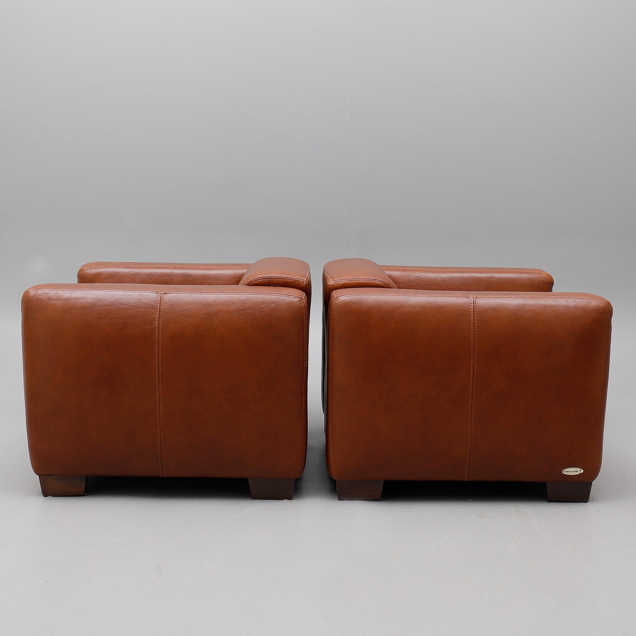 Klädda med brunt skinn, höjd 64, djup 85, bredd 90 cm.