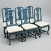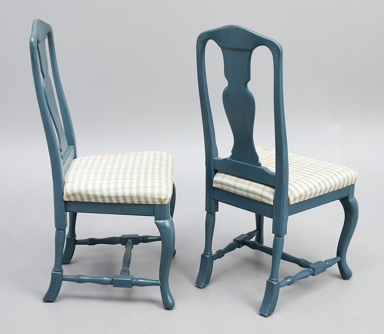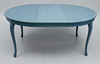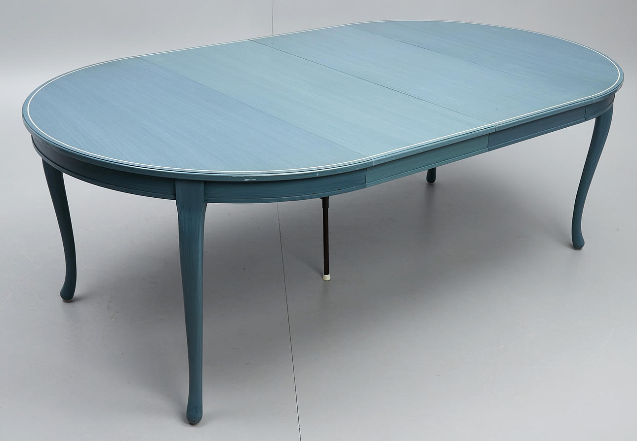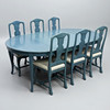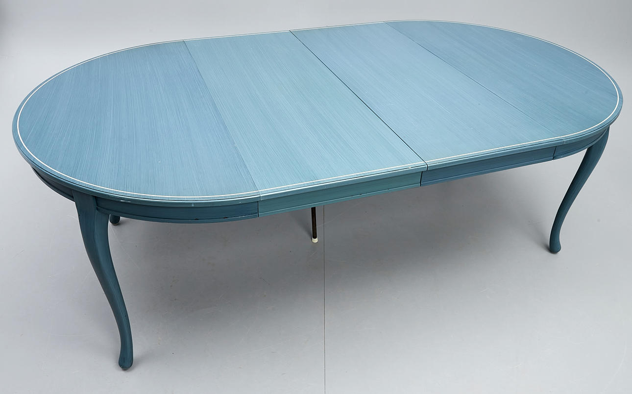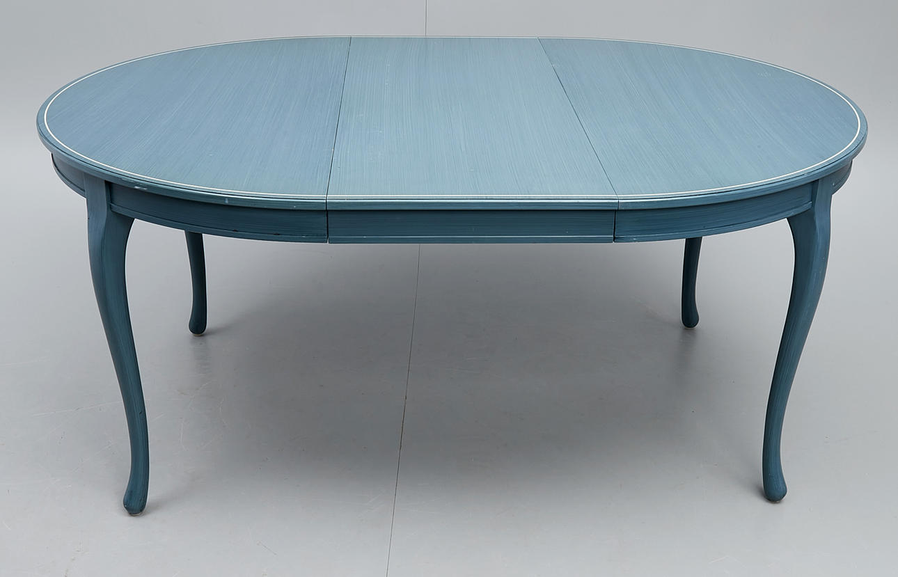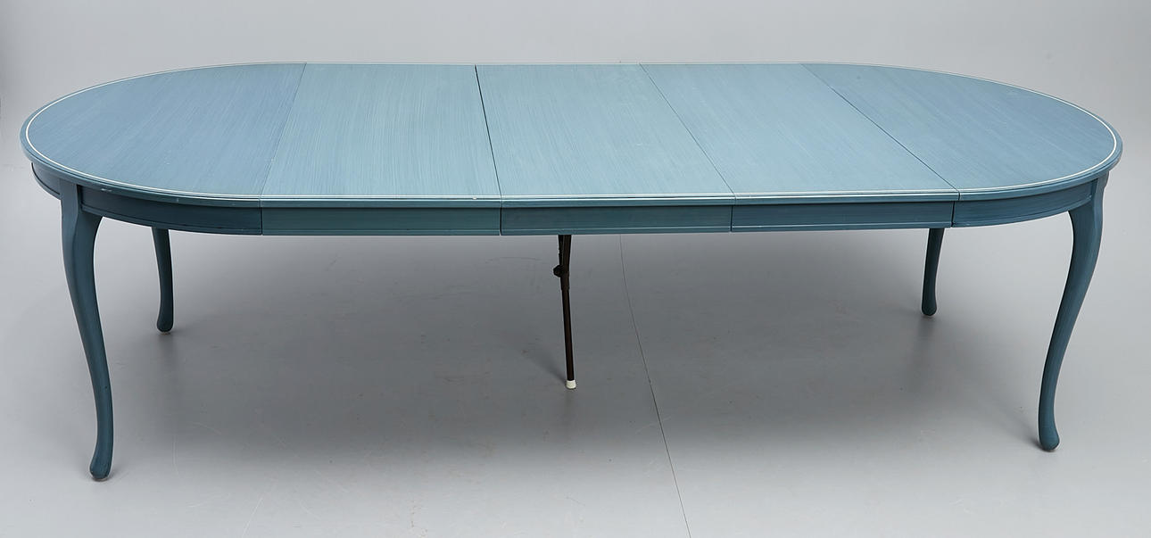 Bord med 3 iläggsskivor, 12 stolar, bordets mått: diameter 120, höjd 73, 3 iläggsskivor med sargkant à 47 cm vardera.
