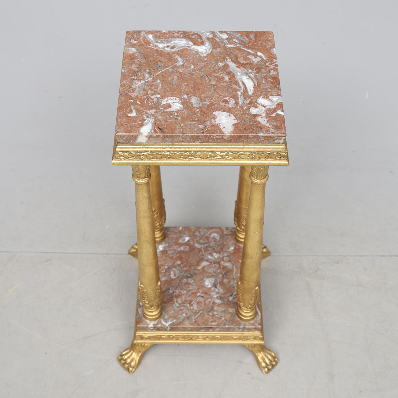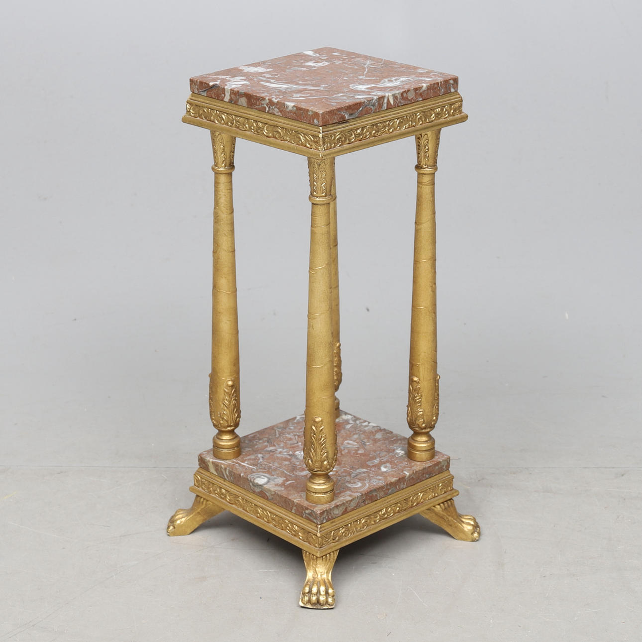 Stomme i förgylld och bronserad metall. Skivor i sten. Ca 26 x 26, höjd 66 cm.