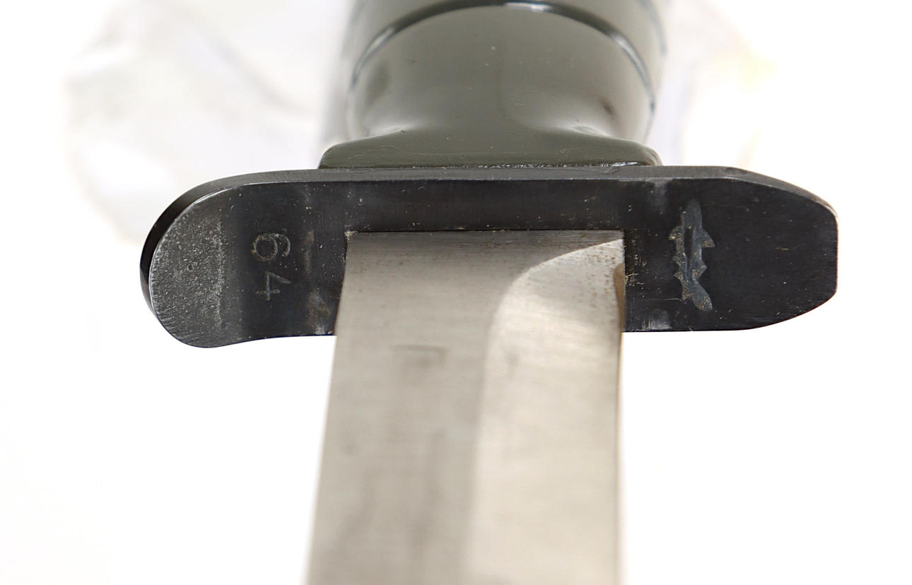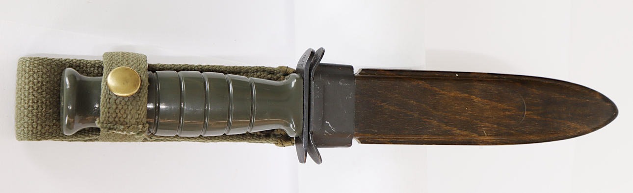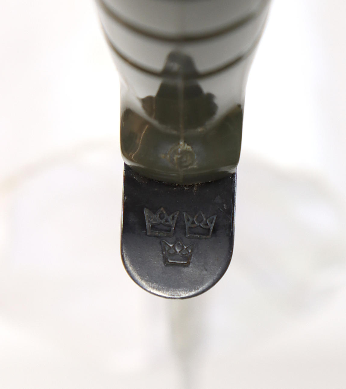 Klinganslängd ca16,5 cm, totallängd ca 28,5 cm, kronmärkt. Balja av trä.