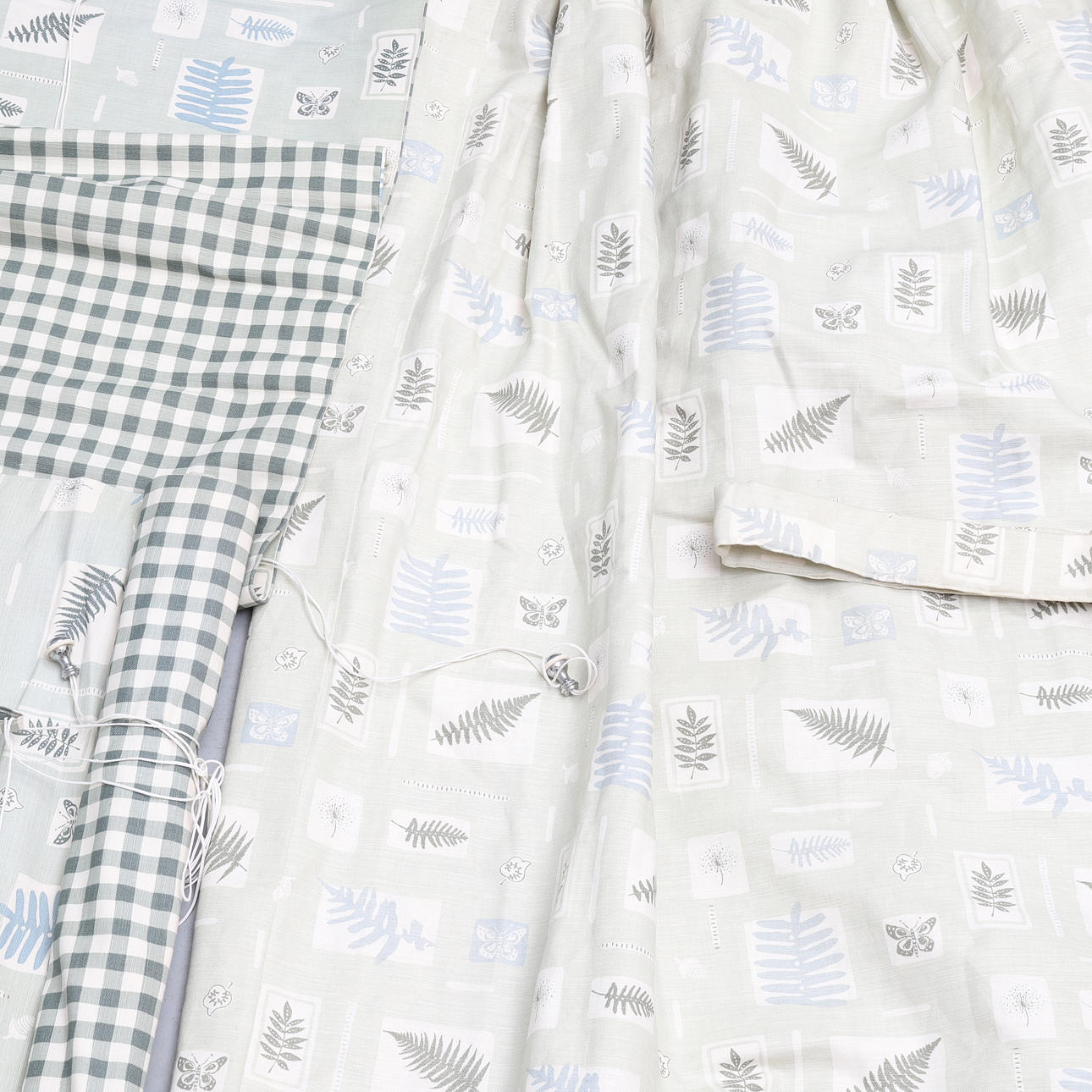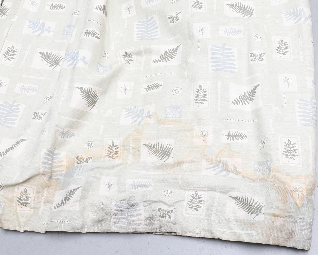ena sidan salvia grön gingham check och den andra sidan dekorerad på en ljusgrön mark med murgröna, ormbunkar och fjärilar etc., 50 cm bred x 144cm droppe, 94 cm bred x 145 cm droppe, tillsammans med en gardin panel, penna veck topp med en salvia grön gingham check foder och krage till toppen och kontrollera trim till ena sidan, med slips tillbaka, topp 268cm bred x 195 cm droppe (4).