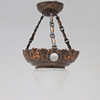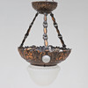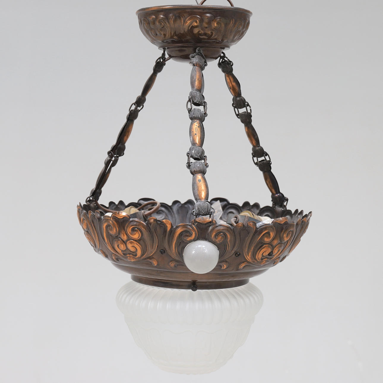 Stomme och upphängning i koppar med bladdekor, kupa i frostat glas. 4 st belysningspunkter.