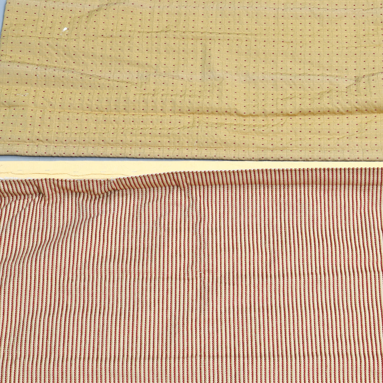 på en kräm/guld bakgrund med en röd och mörk guld rand, grädde foder, dra sladd, 105cm bred x 100cm droppe, tillsammans med en annan romersk blind, ockra kvadrat mönster med rödbrun fläck, vitt foder och dragkabel, 95cm bred x 95cm droppe (2).