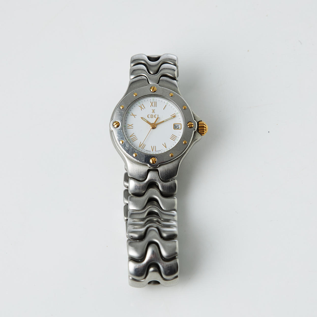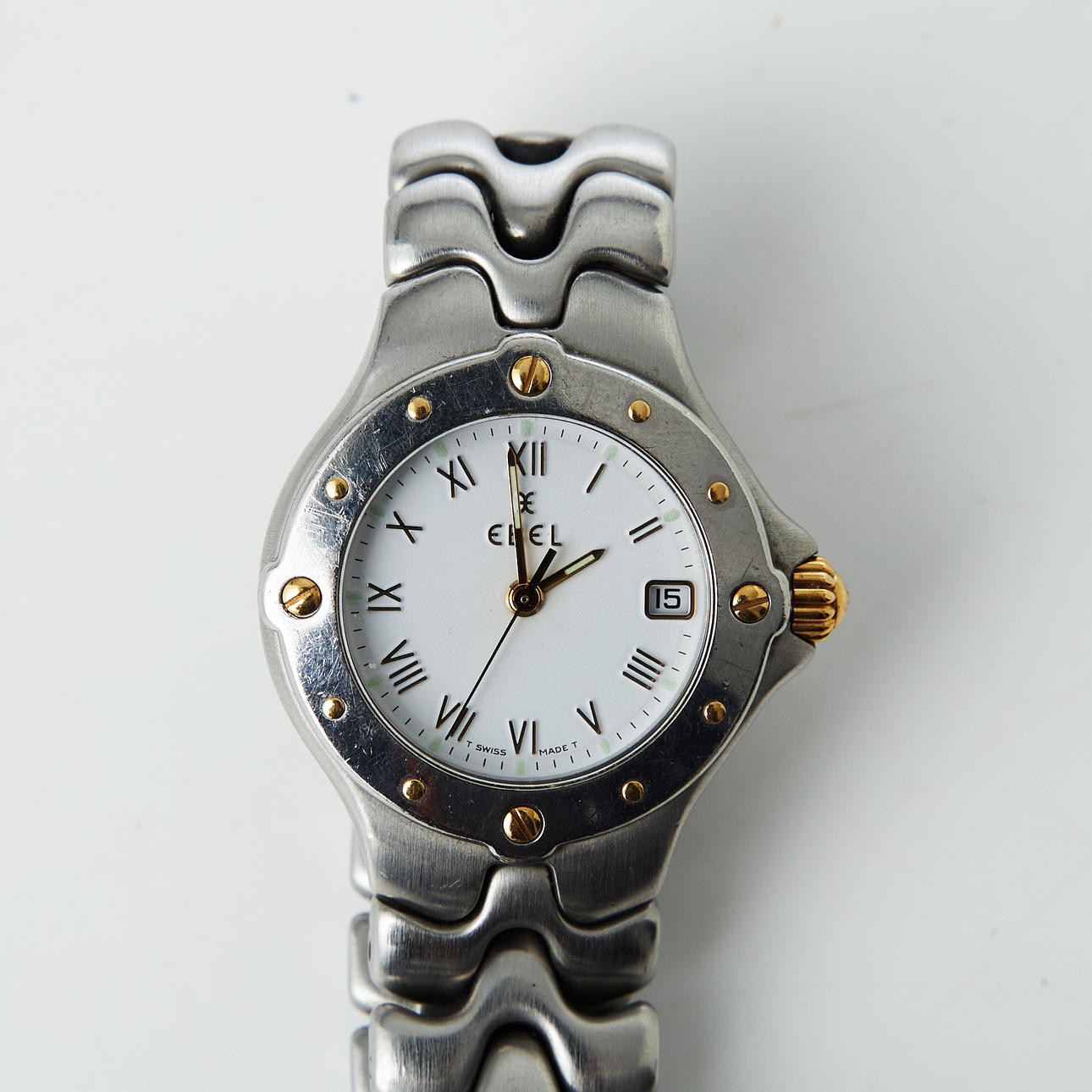 Quartz, safirglas, datum, boettnr. E6087621, integrerad originallänk, viklås, diameter 28 mm.