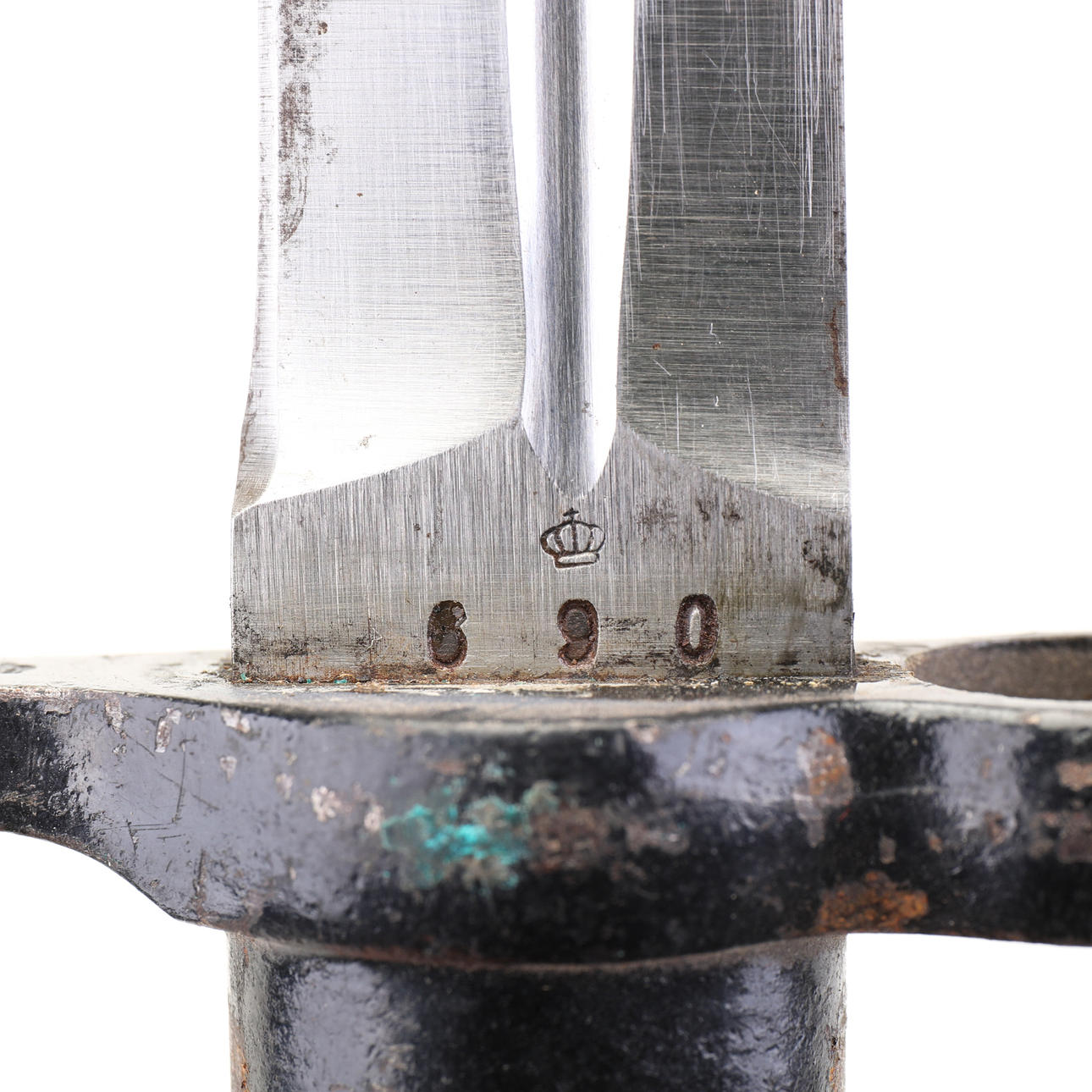 Bajonetten är stämplad med EJ AB samt ett krönt ankare vilket visar att den är tillverkad i Eskilstuna, den är även numrerad med siffrorna 690.